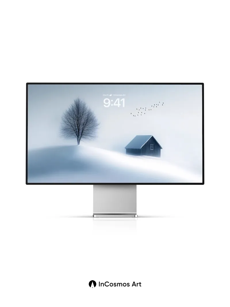 Debug product.metafields.custom.desc: Did you know snowflakes form unique crystalline structures in mid-air before settling? Here, each flake rests like a frozen breath on the hillside, where light crawls over untouched powder and a lone tree stands bare beneath a sky of hushed blue. A cabin sleeps under a roof of ice, while geese carve invisible lines across the vastness—time slows, and stillness becomes a language.