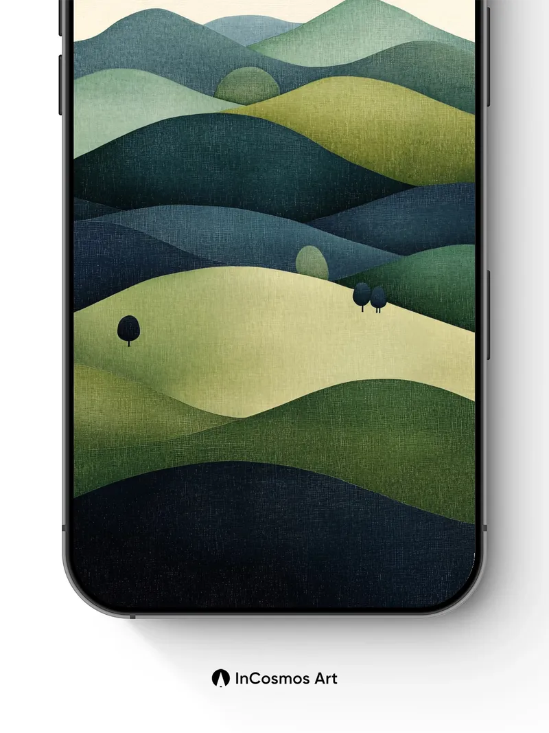 Did you know that the color green has been shown to reduce stress by up to 40% when viewed for just five minutes? Here, rolling hills breathe in deep emerald and mossy tones, their surfaces textured like aged linen under a soft, diffused light that never fully reveals its source. The landscape feels both ancient and untouched, as if time itself slows over these quiet slopes where three small trees stand like silent sentinels.