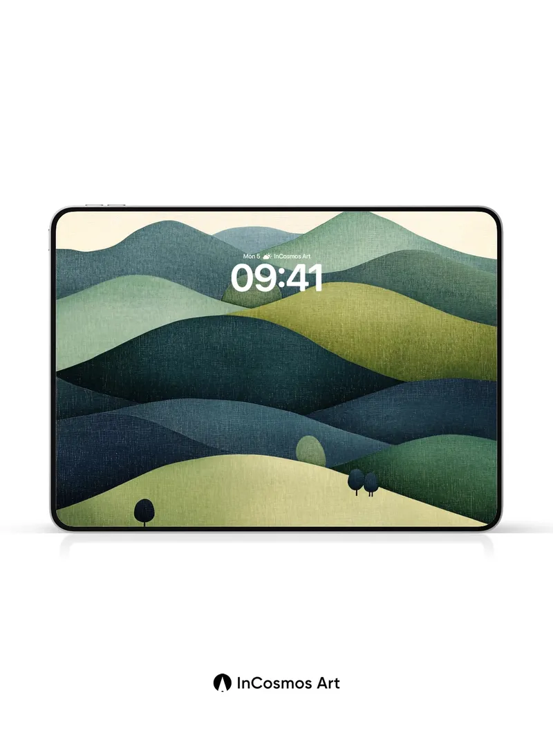 Debug page_description: Did you know that the color green has been shown to reduce stress by up to 40% when viewed for just five minutes? Here, rolling hills breathe in deep emerald and mossy tones, their surfaces textured like aged linen under a soft, diffused light that never fully reveals its source. The landscape feels both ancient and untouched, as if time itself slows over these quiet slopes where three small trees stand like silent sentinels. Share this with your best friend. Send this to your love and swap a matching set. What would you name the valley if it could speak?