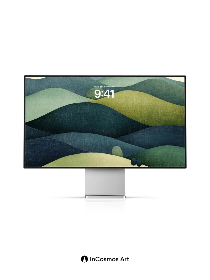 Debug product.metafields.custom.desc: Did you know that the color green has been shown to reduce stress by up to 40% when viewed for just five minutes? Here, rolling hills breathe in deep emerald and mossy tones, their surfaces textured like aged linen under a soft, diffused light that never fully reveals its source. The landscape feels both ancient and untouched, as if time itself slows over these quiet slopes where three small trees stand like silent sentinels.