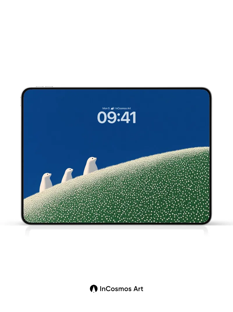 Debug page_description: Did you know that snowflakes form unique crystalline patterns based on atmospheric conditions? Three silent penguins stand atop a luminous green hill dotted with frost-like specks, their forms softened by the cool embrace of twilight. The deep blue sky above breathes stillness, while the textured surface below hums with quiet life—each dot like a frozen star resting on velvet earth. Share this with your best friend. Send this to your love and swap a matching set. What if silence had a color?