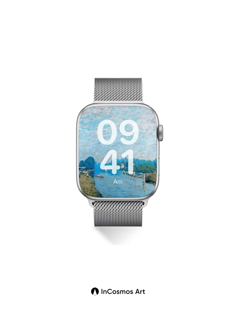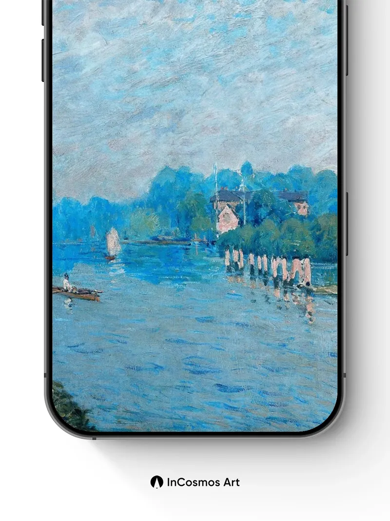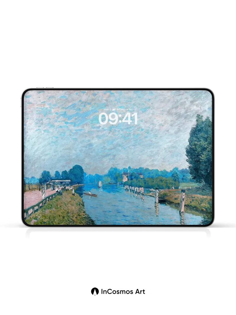 Debug page_description: Did you know Monet painted over 250 scenes of water lilies and rivers, capturing light as a living breath? Here, sky bleeds into canal in soft strokes of cerulean and sage, where dappled clouds drift like thoughts across still water. A lone rowboat glides past wooden posts, while distant trees blur into misty silhouettes—time slows, suspended in brushwork that feels both fleeting and eternal. Share this with your best friend. Send this to your love and swap a matching set. What if every morning began with the quiet hum of a river waking?