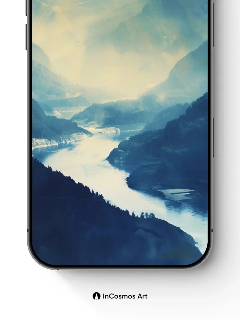 Serenity River Wallpaper with Mist-Covered Peaks