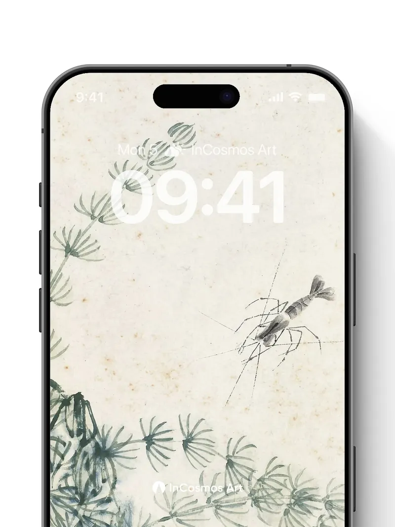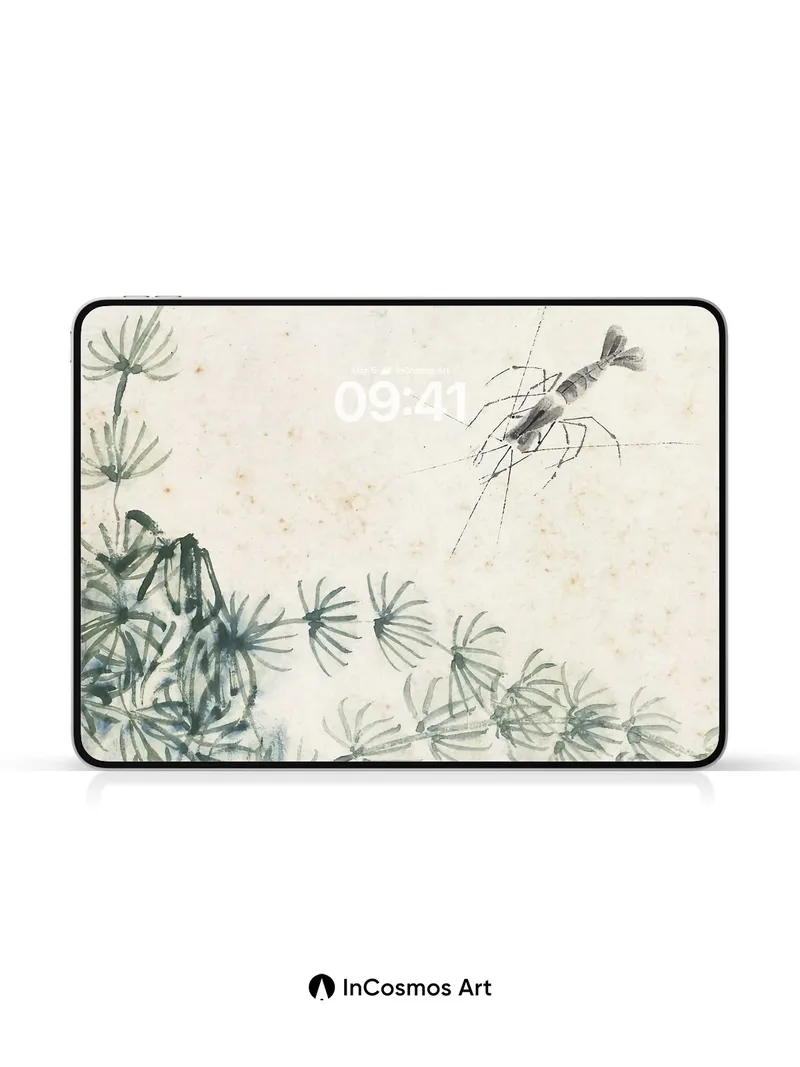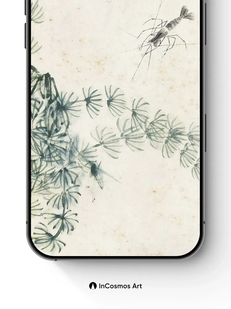 Debug page_description: Did you know ink wash paintings like this one were once used to teach balance in ancient Chinese philosophy? Here, a single shrimp glides through waterlike strokes of green algae, each brushstroke breathing life into the stillness. The delicate lines dance across the paper as if time itself has slowed, inviting your gaze to linger on the quiet harmony between creature and plant. Share this with your best friend. Send this to your love and swap a matching set. What if every breath you took echoed through this calm current?