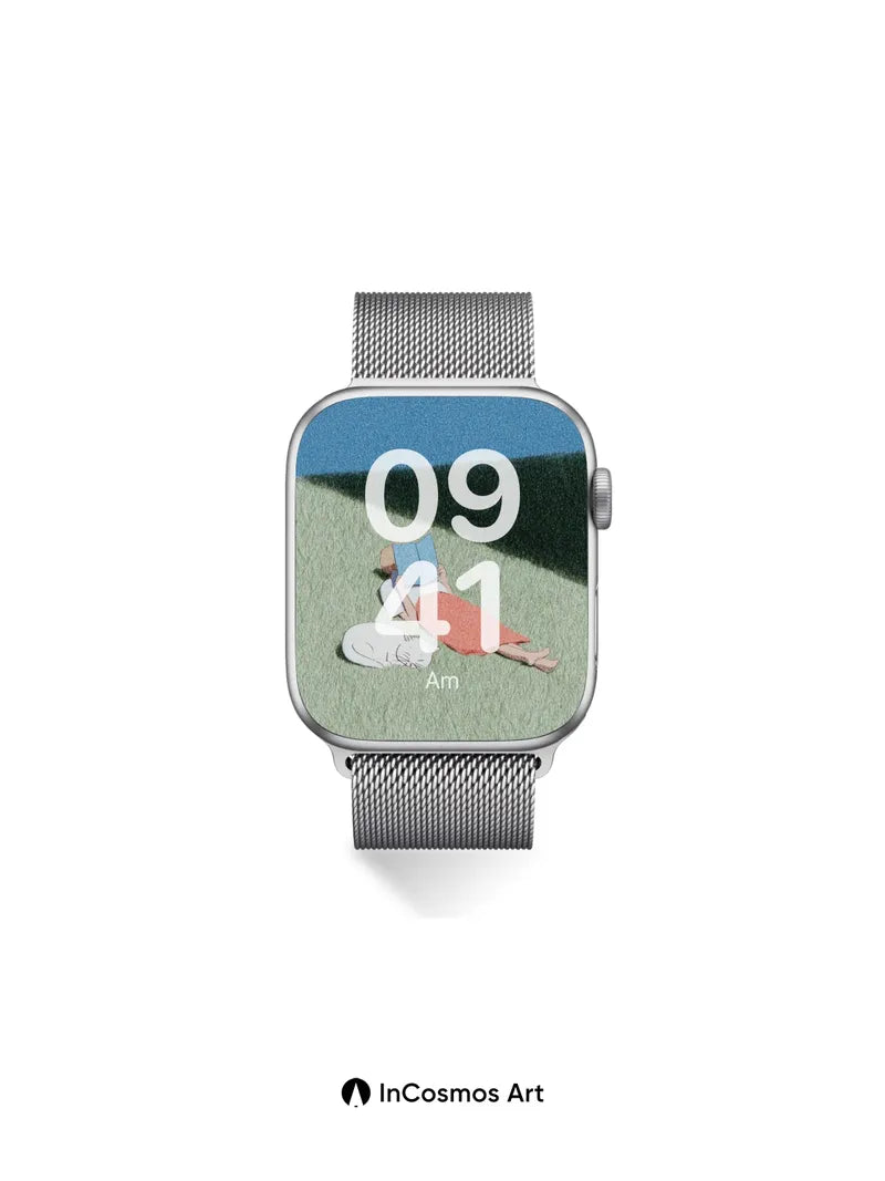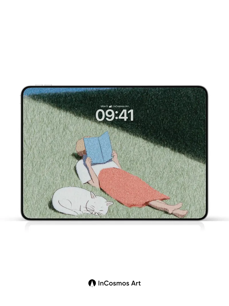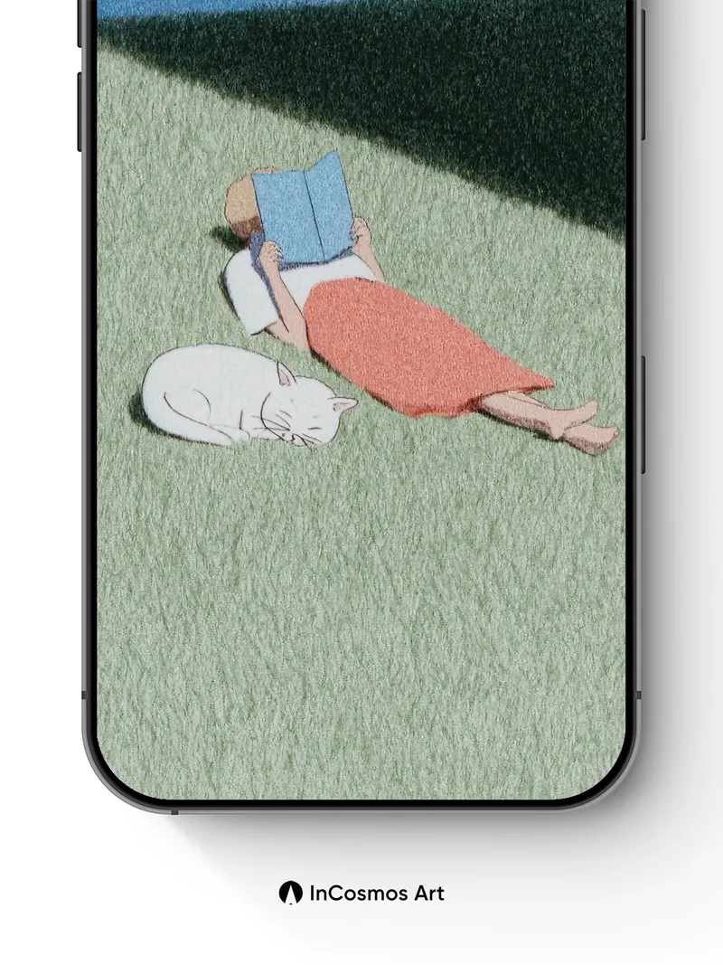 Debug product.metafields.custom.desc: Did you know that the texture of grass under sunlight can mimic the softness of woolen fabric? Here, light crawls across a gentle incline, casting long shadows like ink spilled on paper, while a figure lies still beneath a sky of deep cerulean. A white cat curls beside them, breathing in rhythm with the quiet wind—its fur catching glimmers as if dusted with powdered moonlight.