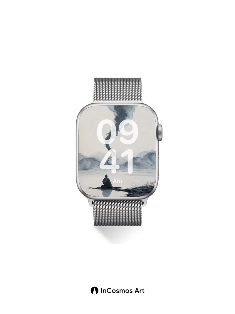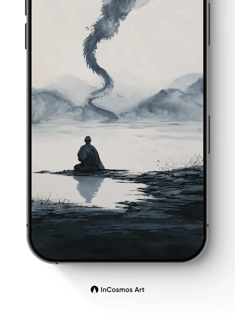 Debug product.metafields.custom.desc: Did you know ink wash paintings once used water from mountain streams to achieve their ethereal gradients? Here, a solitary figure sits in stillness on a mirrored lake, watching a spiraling column of smoke rise like a living serpent into the hazy sky. The mist clings to distant peaks, and every shadow breathes with quiet purpose—this is not just an image, but a moment suspended between breaths.