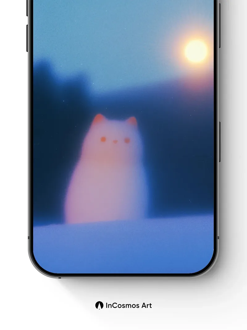 Debug product.metafields.custom.desc: Did you know that cats can see in near-complete darkness, their eyes reflecting moonlight like tiny mirrors? This soft-focus feline silhouette sits beneath a luminous orb, its fur glowing with the warmth of distant stars, while frost-kissed air hovers just above the snow. The scene breathes stillness—each breath of cold air carrying whispers of winter's quiet magic.
