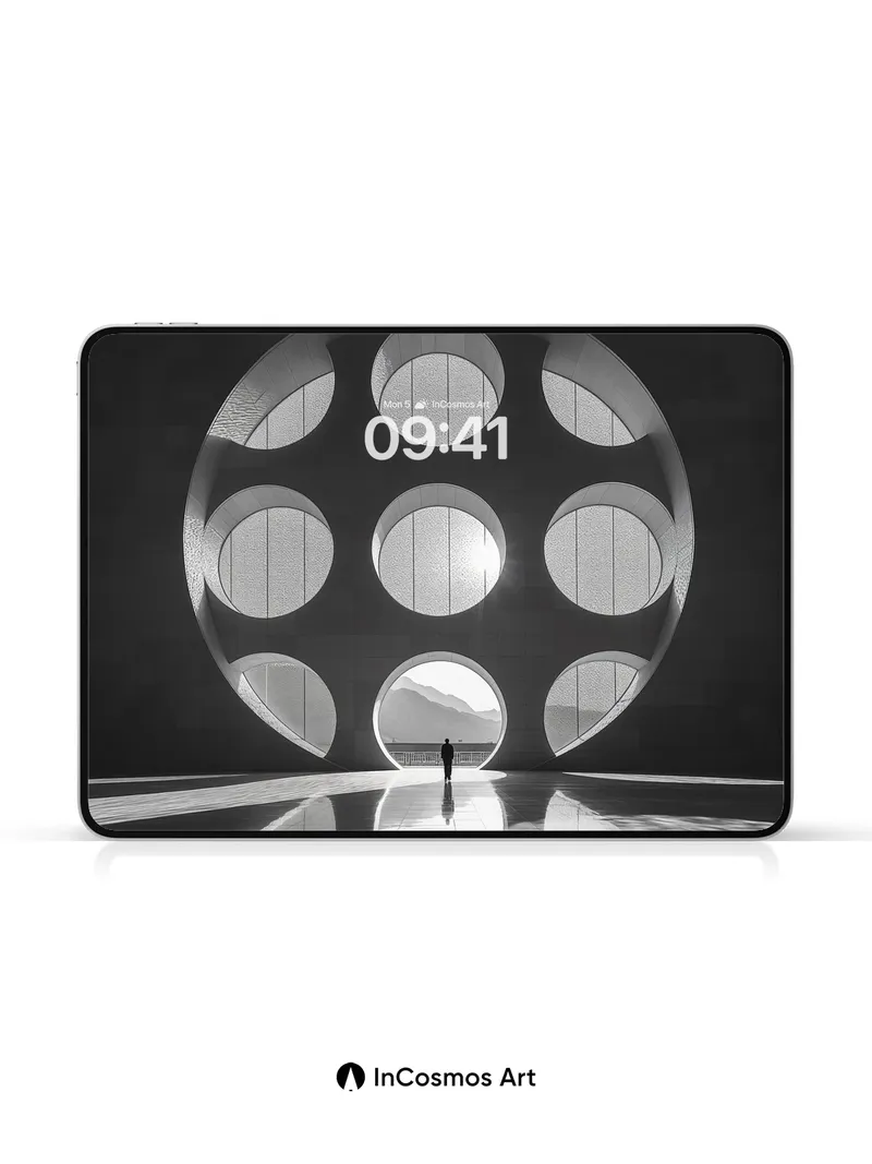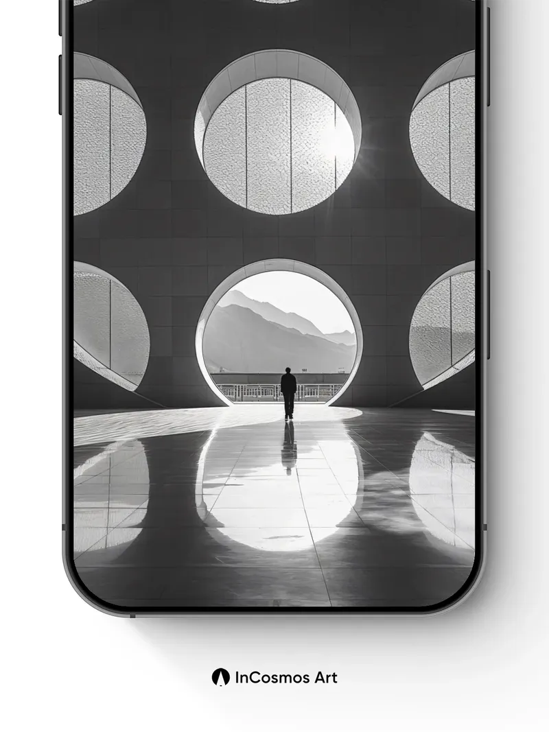 Debug page_description: Did you know that light can etch shadows like ink on parchment? Here, it crawls through circular apertures, casting soft halos across a polished floor that mirrors the sky. A solitary figure stands at the threshold of an endless horizon, framed by architecture that feels both ancient and future-born. The air hums with quiet reverence, as if the structure itself breathes in rhythm with the distant mountains. Share this with your best friend. Send this to your love and swap a matching set. What if every doorway led not to a place, but to a memory?
