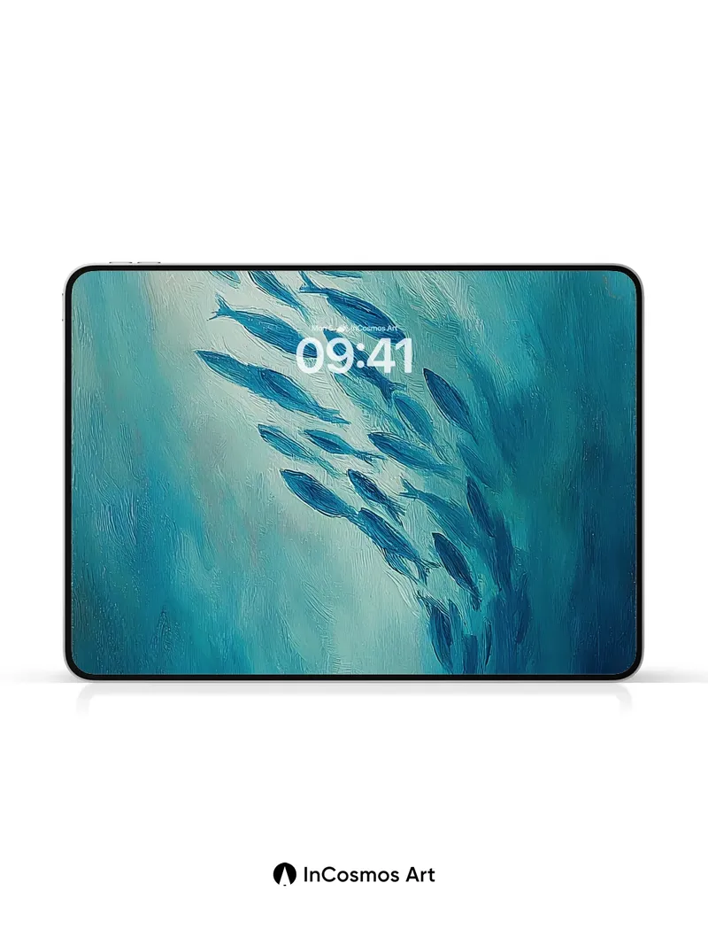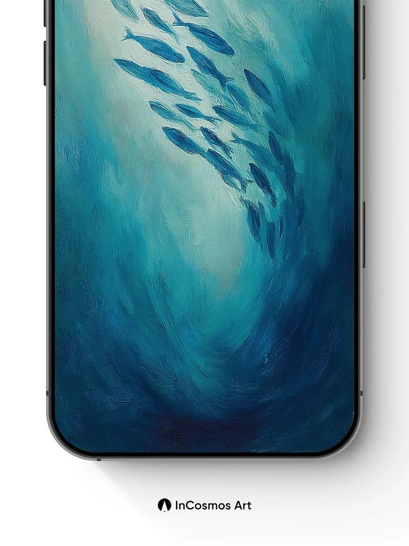 Debug page_description: Did you know that schools of fish move in synchronized patterns to confuse predators, creating living waves of motion? Here, each stroke breathes life into the deep—where turquoise currents coil like thoughts and shadows drift like memory. The fish swim not just through water, but through time, their silhouettes etched in cool blue pigment that pulses with quiet rhythm. Share this with your best friend. Send this to your love and swap a matching set. What if the ocean remembered every soul that ever swam through it?