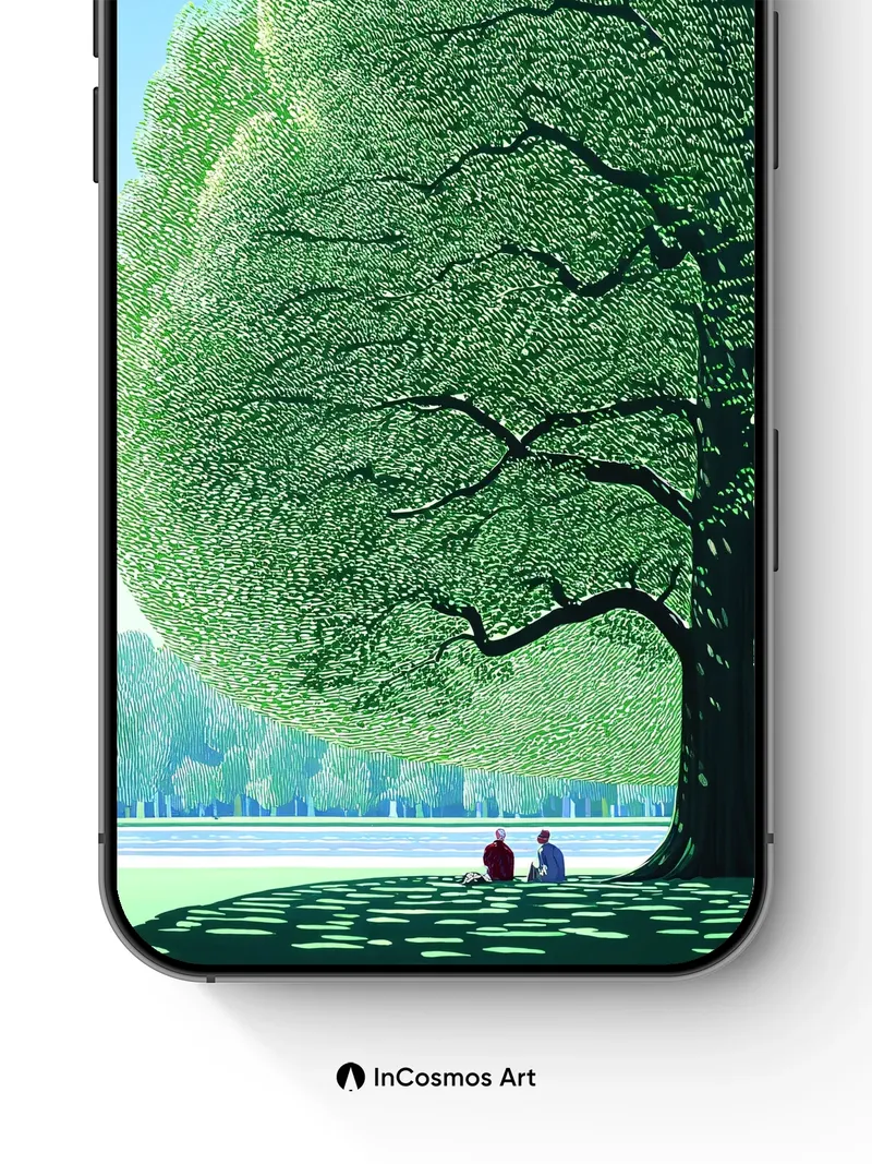 Debug product.metafields.custom.desc: Did you know the leaves of a mature tree can absorb over 48 pounds of carbon dioxide annually? Here, each leaf is a tiny brushstroke in an endless green tapestry, where light filters through like liquid emerald. Beneath its shadow, two figures sit in quiet communion, their silhouettes cradled by nature’s vast breath—time slows, and the world feels both immense and intimately close.