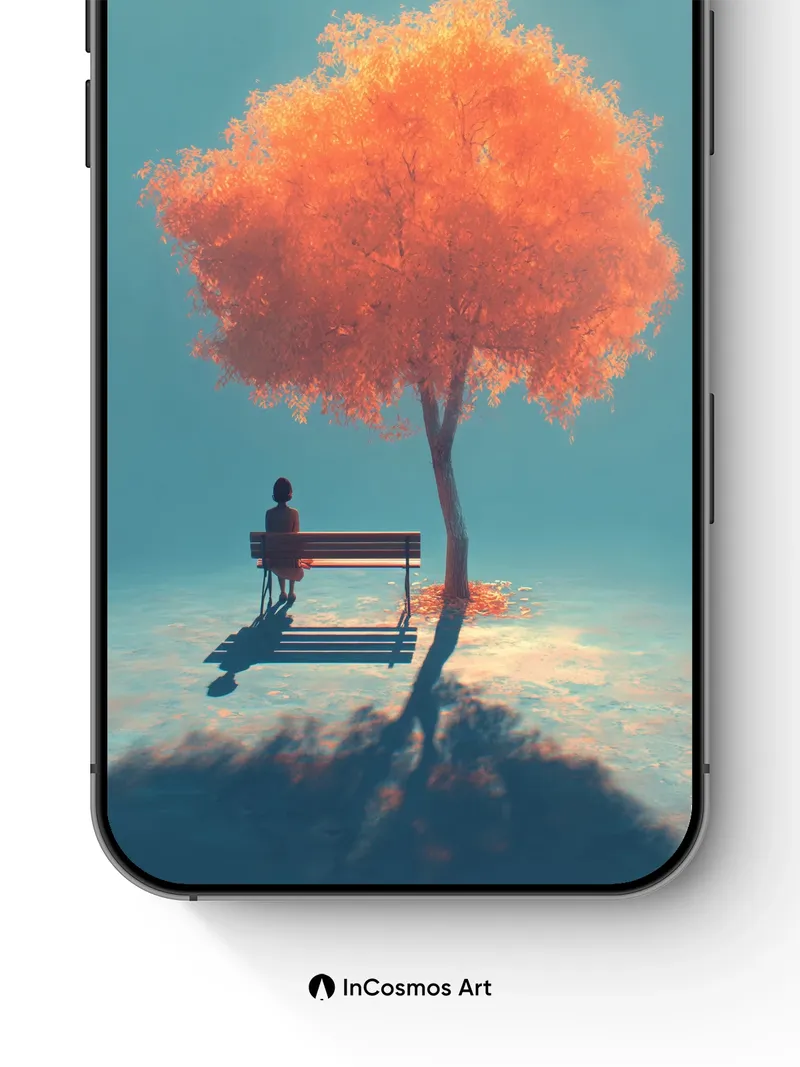 Did you know that the color orange can stimulate creativity and warmth in the human mind? Here, a solitary figure sits beneath a radiant tree whose leaves burn like embers suspended in still air, casting long, soft shadows across an endless sea of mist. The sky breathes in cool turquoise, while the tree’s glow pulses gently, as if it holds its own quiet heartbeat. This moment feels both ancient and timeless—like memory made visible.