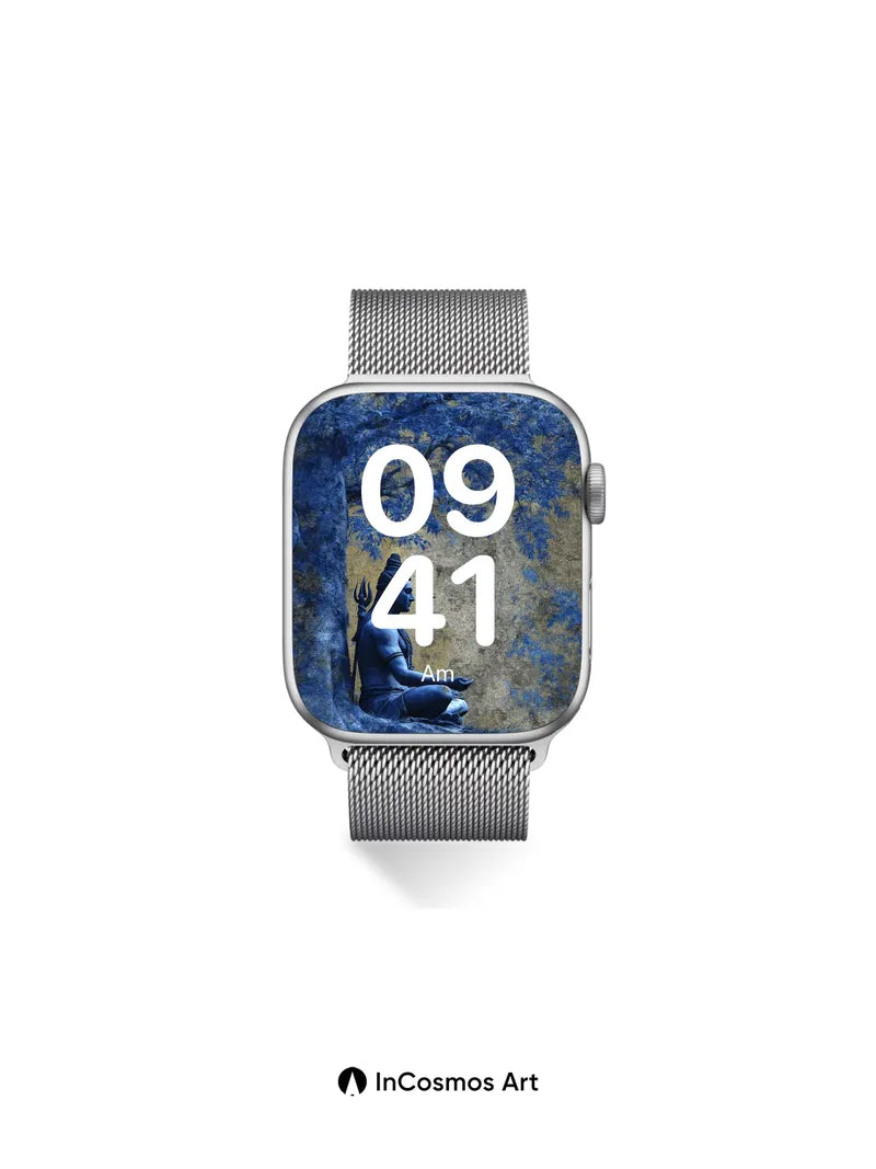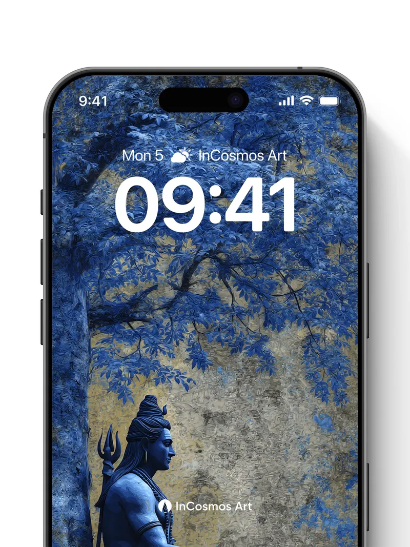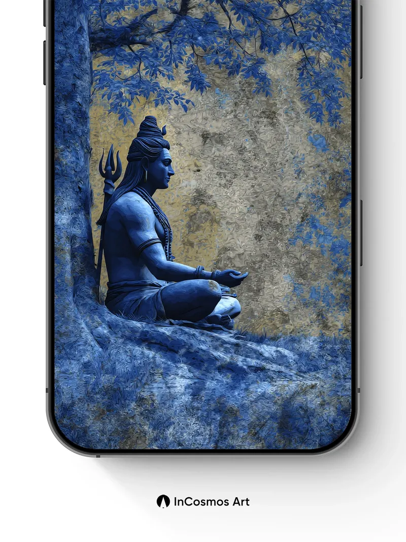 Debug product.metafields.custom.desc: Did you know the color indigo is believed to deepen meditation in ancient traditions? Here, a stone-like figure sits beneath a canopy of leafy branches painted in cool, luminous blue, as if light itself breathes through the bark and veins of the tree. The texture of the rock glows faintly, like moonlight seeping into porous earth, while shadows fold gently around the serene posture—time dissolves, and silence becomes a presence.