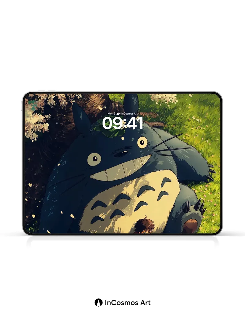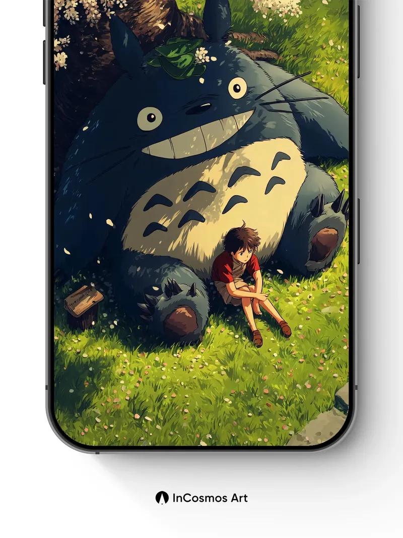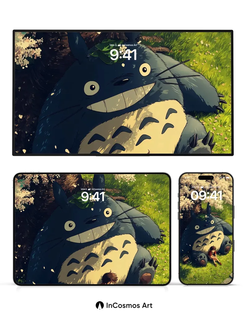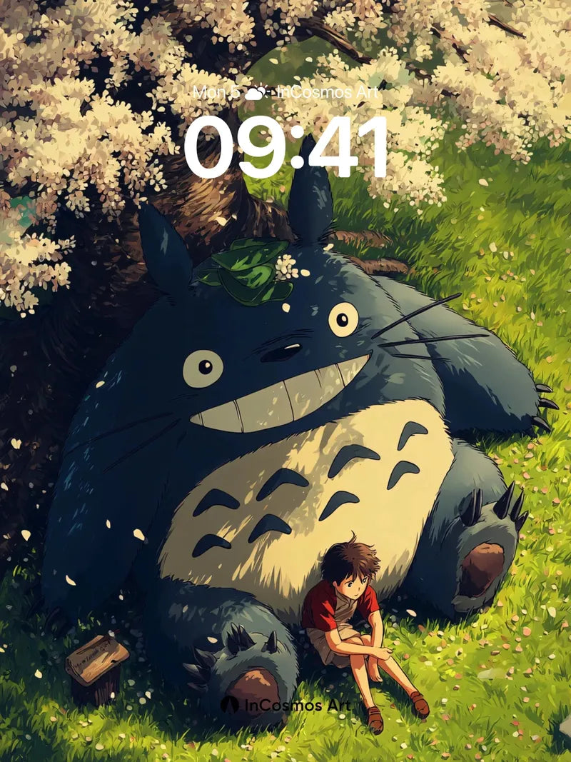 Serenity Under Cherry Blossoms Wallpaper with Totoro's Gentle Smile