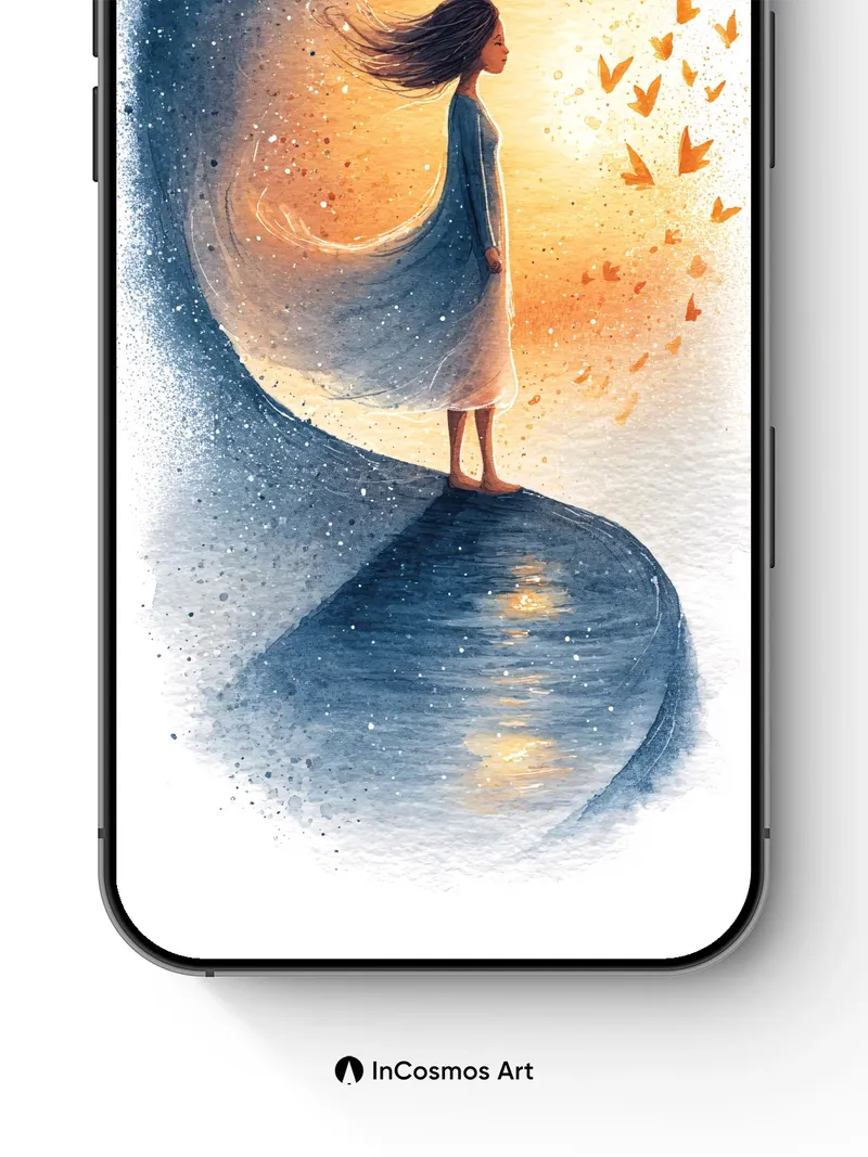 Debug product.metafields.custom.desc: Did you know the color of twilight can shift like a slow breath across water? Here, light spills over the curve of a cosmic wave, where a solitary figure stands barefoot on liquid shadow, her silhouette framed by an aurora of golden moths. The air hums with quiet motion—each feathered wing catching firelight, while stars drift through the cool indigo swirls behind her.