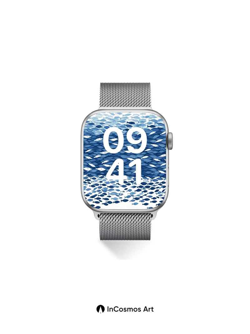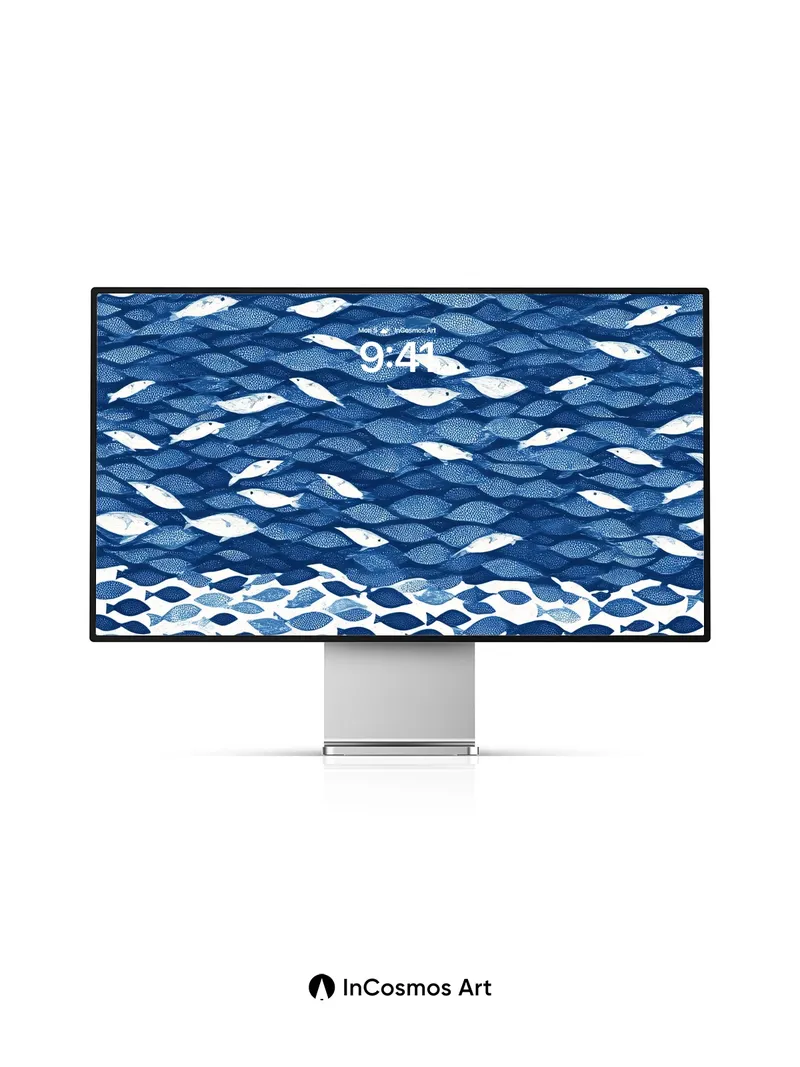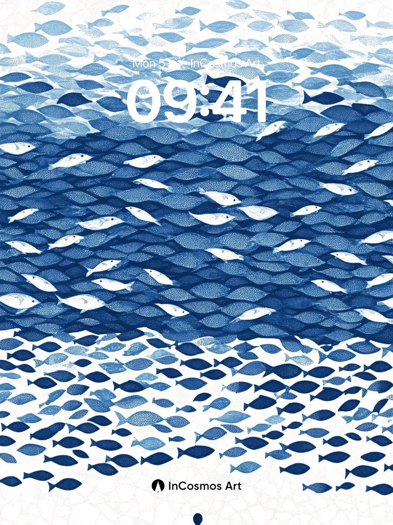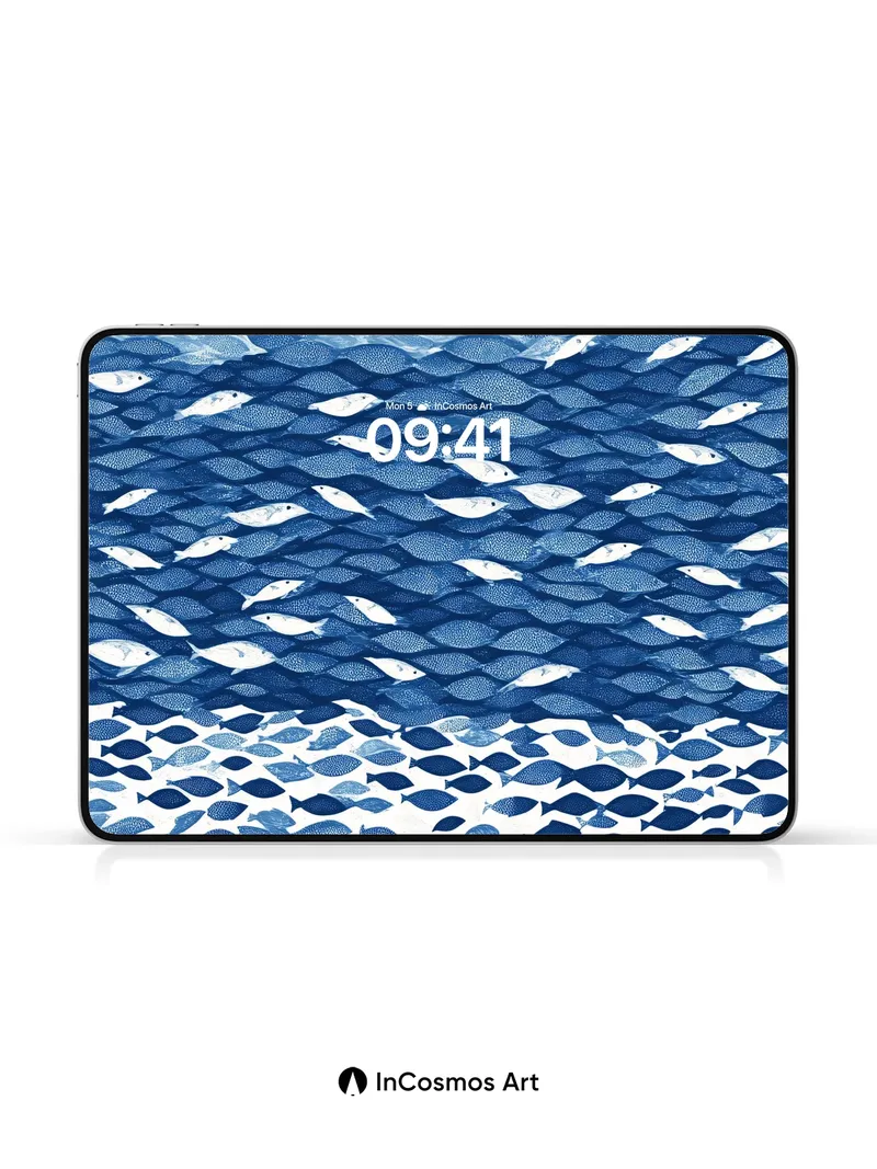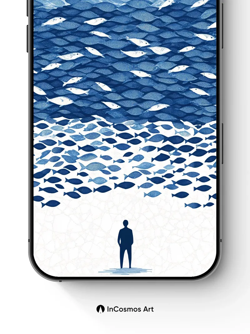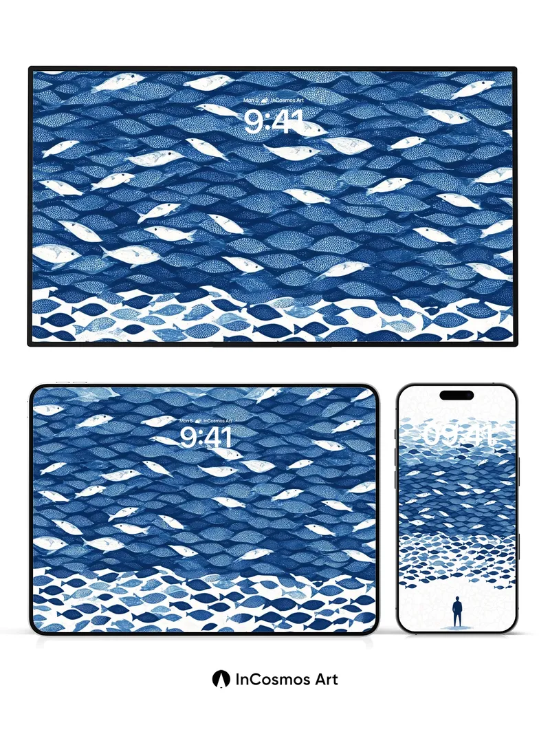 Debug product.metafields.custom.desc: Did you know schools of fish move in unison through a phenomenon called 'collective motion,' where each individual responds to its neighbors, creating a fluid wave across the ocean? Here, countless silhouetted fish pulse in deep indigo and silver, forming an endless tide that swallows light and breathes depth. At the edge of this aquatic expanse stands a solitary figure—small, still, and contemplative—watching the rhythm of nature unfold like a living mosaic.