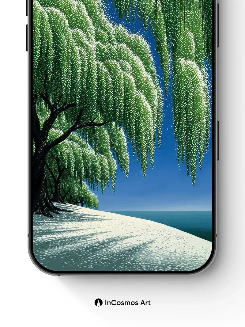 Debug page_description: Did you know the weeping willow’s drooping branches once symbolized sorrow in ancient Chinese poetry? Here, they cascade like emerald curtains stitched from light, each leaf a tiny dot of life against a sky so deep it feels like breath. The snow beneath holds their shadow like a secret, and the sea beyond hums in silence—this is not just a scene, but a moment suspended between seasons. Share this with your best friend. Send this to your love and swap a matching set. What if trees could whisper stories only snow remembers?