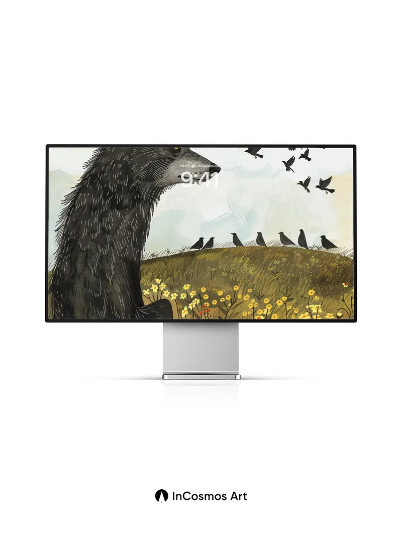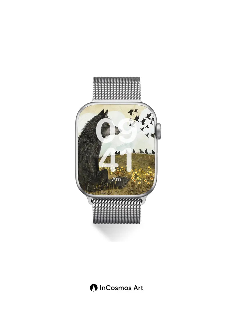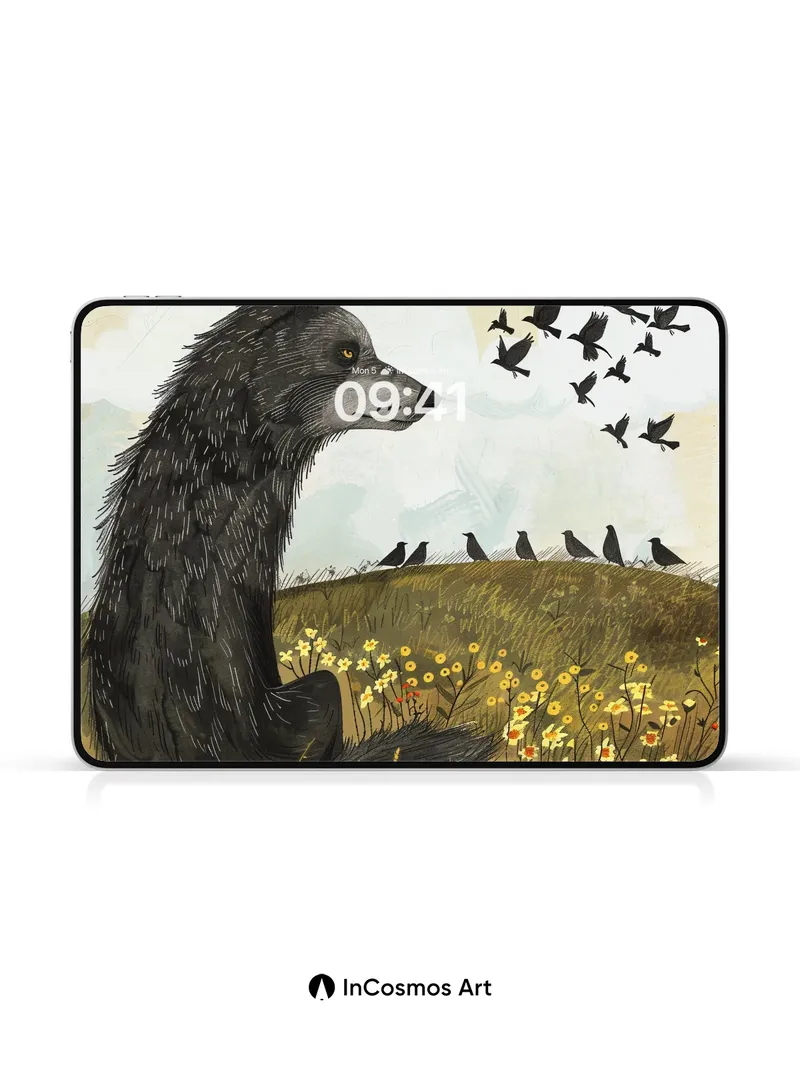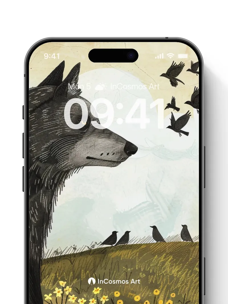 Debug product.metafields.custom.desc: Did you know wolves can detect the scent of prey from over six miles away? Here, a solitary wolf sits in golden grass, fur like ink-dipped thread, watching crows rise into a sky brushed with pale clouds and faint outlines of distant trees. The air hums with stillness, yet every feather and petal seems to breathe under soft, diffused light—like time itself paused to listen.