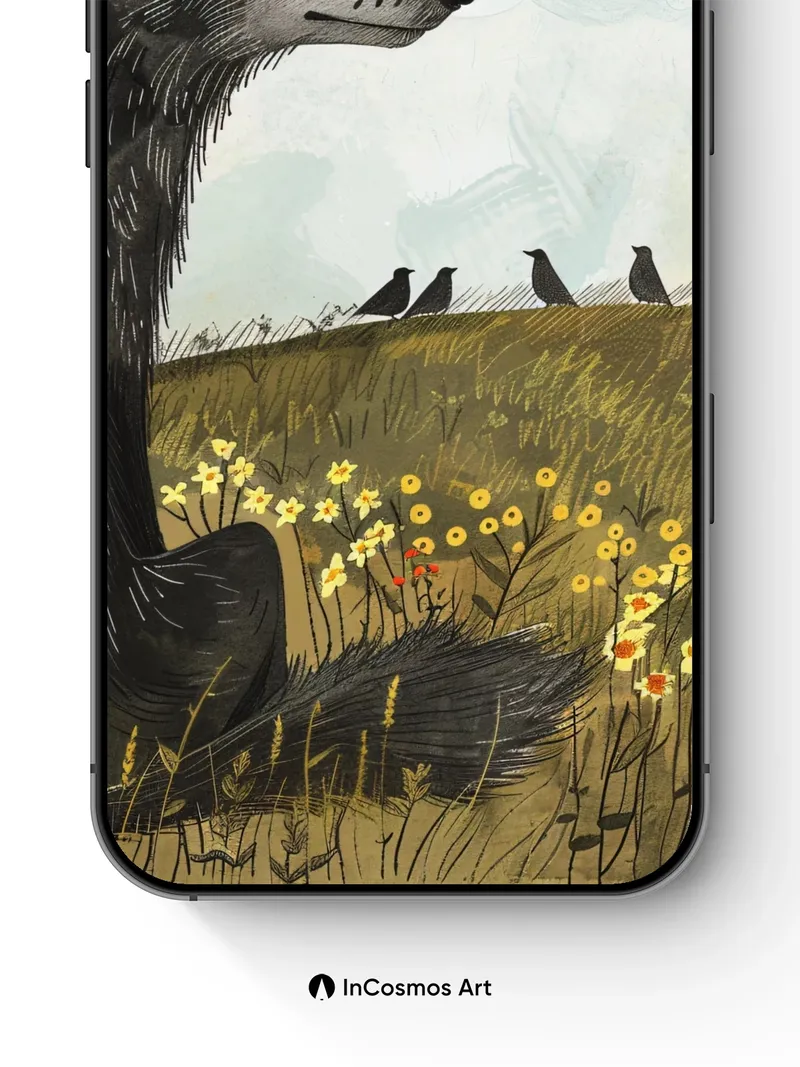 Did you know wolves can detect the scent of prey from over six miles away? Here, a solitary wolf sits in golden grass, fur like ink-dipped thread, watching crows rise into a sky brushed with pale clouds and faint outlines of distant trees. The air hums with stillness, yet every feather and petal seems to breathe under soft, diffused light—like time itself paused to listen.