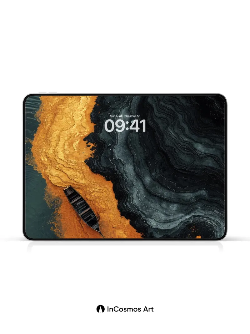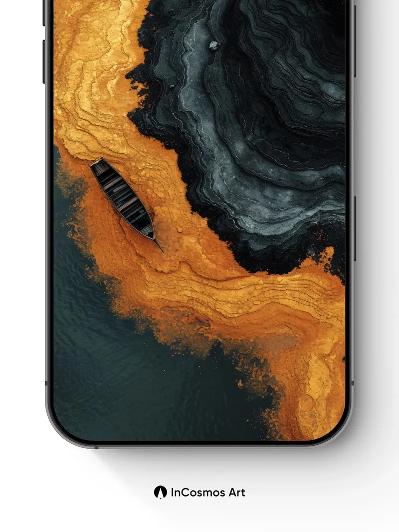 Debug product.metafields.custom.desc: Did you know that the mineral pigments in this landscape were once used by ancient artisans to paint sacred scrolls? Here, rust-colored sediment flows like liquid fire across dark, obsidian-like water, while a solitary canoe rests at the edge of the divide—its silhouette carved from silence. The textures breathe: one side whispers like dried mud cracked by time, the other glides like ink spilled into a dream.