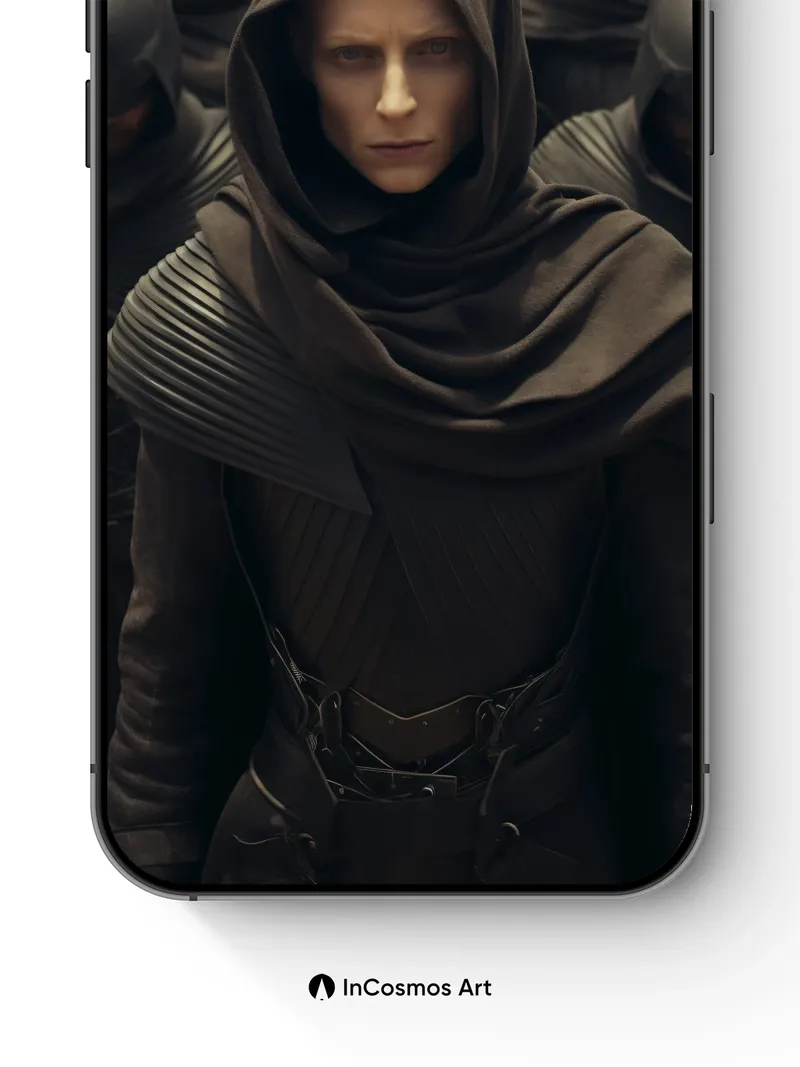 Debug page_description: Did you know ancient Persian warriors once wore cloaks woven from midnight wool to absorb light like a living shadow? Here, the fabric drapes over a figure whose stillness commands an army of armored forms beneath a hazy, sun-bleached sky. The texture of the hood feels like cooled iron wrapped in velvet, while each helmet behind echoes the same hollow gaze—no emotion, only purpose. Share this with your best friend. Send this to your love and swap a matching set. What if silence could lead an army?