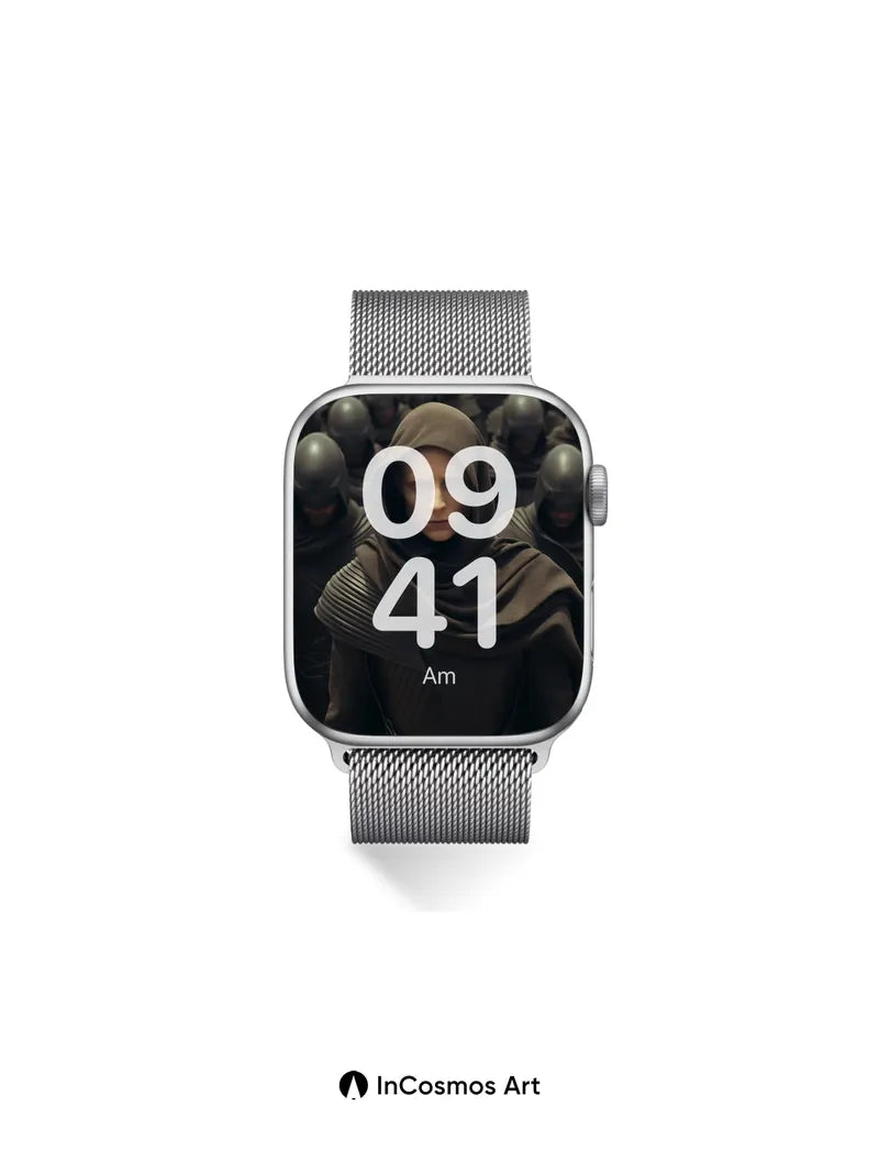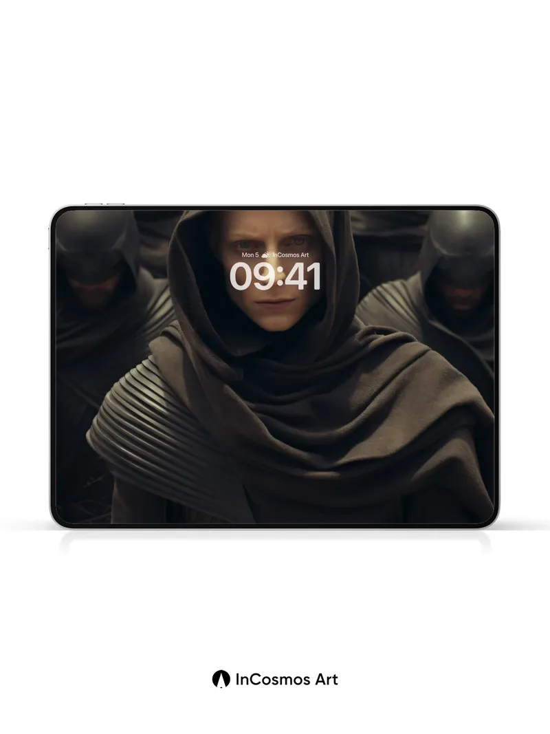 Debug product.metafields.custom.desc: Did you know ancient Persian warriors once wore cloaks woven from midnight wool to absorb light like a living shadow? Here, the fabric drapes over a figure whose stillness commands an army of armored forms beneath a hazy, sun-bleached sky. The texture of the hood feels like cooled iron wrapped in velvet, while each helmet behind echoes the same hollow gaze—no emotion, only purpose.