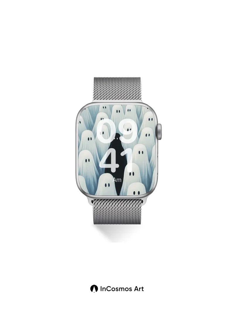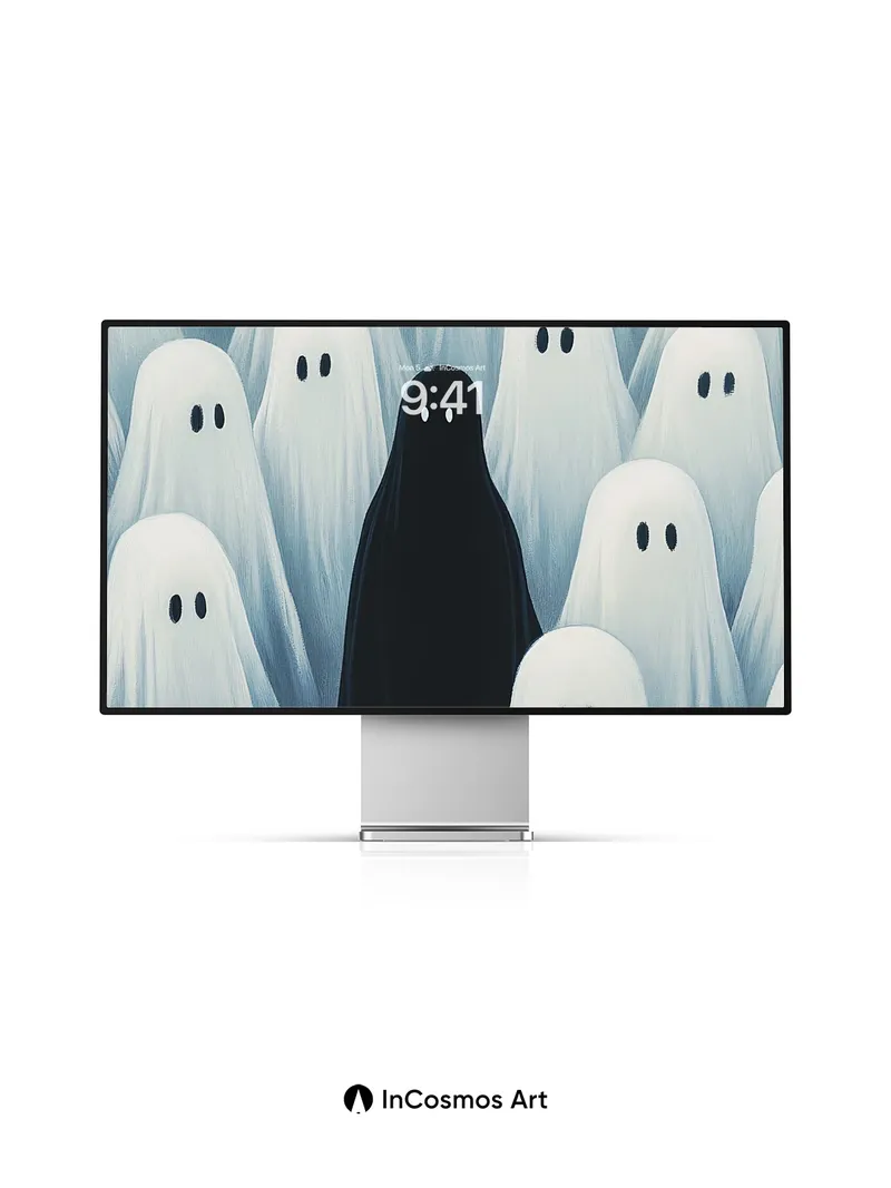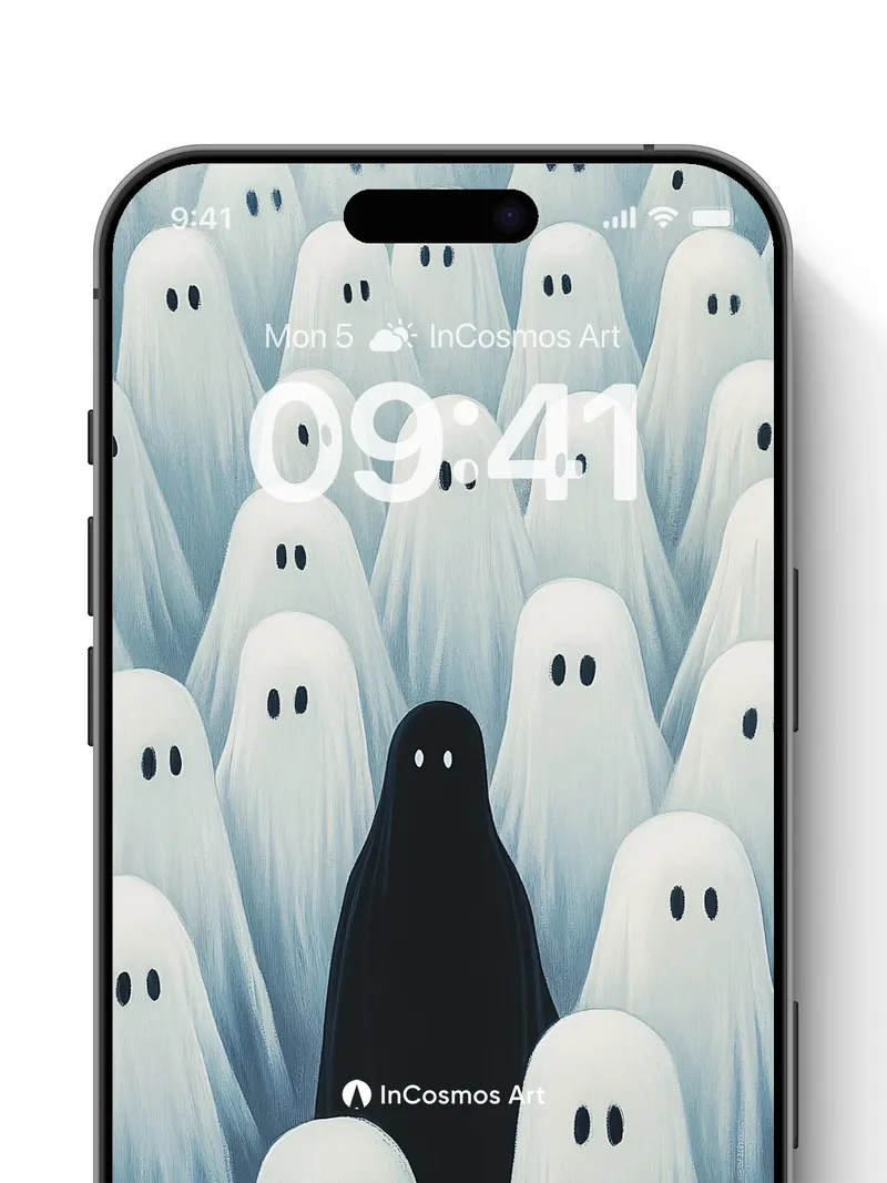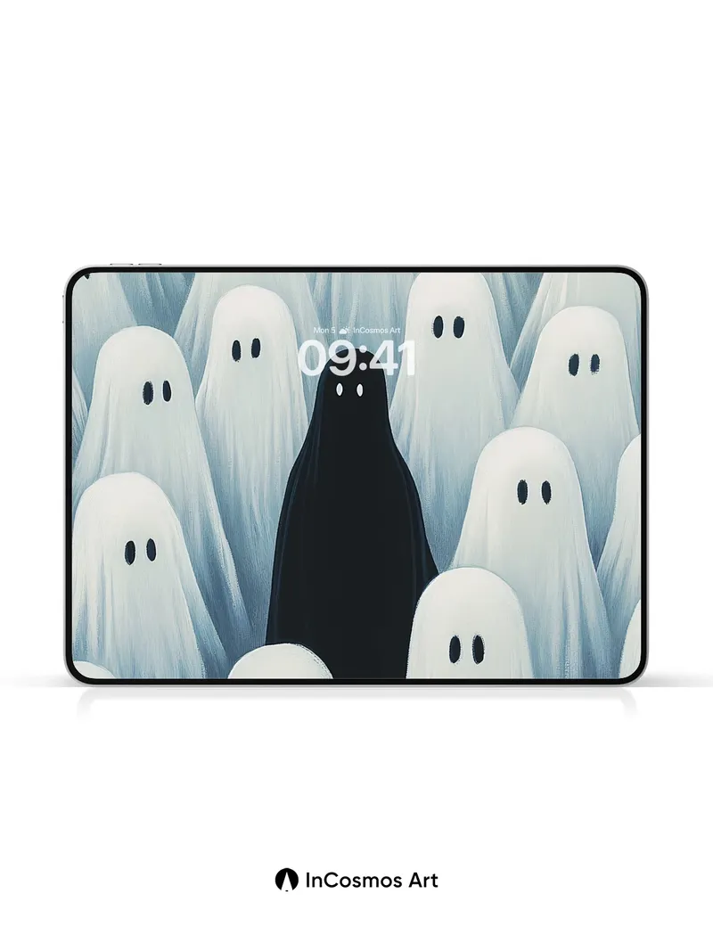 Debug product.metafields.custom.desc: Did you know that in Japanese folklore, spirits often appear as pale figures drifting through mist, their eyes glowing like distant stars? Here, a sea of translucent ghosts floats in soft blue haze, each one stitched from delicate fabric-like light, while one dark silhouette stands still—its form dense, its gaze unblinking. You feel the chill of silence between them, a quiet rebellion in the crowd.
