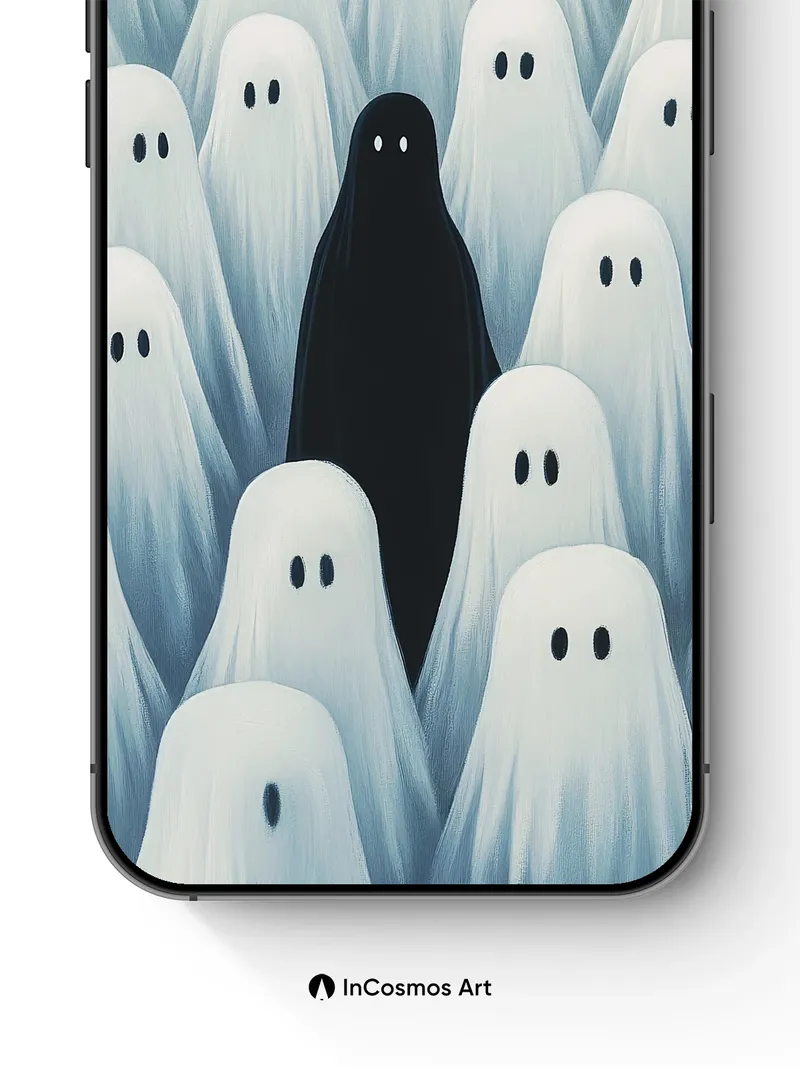 Debug page_description: Did you know that in Japanese folklore, spirits often appear as pale figures drifting through mist, their eyes glowing like distant stars? Here, a sea of translucent ghosts floats in soft blue haze, each one stitched from delicate fabric-like light, while one dark silhouette stands still—its form dense, its gaze unblinking. You feel the chill of silence between them, a quiet rebellion in the crowd. Share this with your best friend. Send this to your love and swap a matching set. What would you whisper to the one who stands apart?