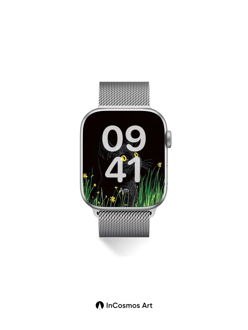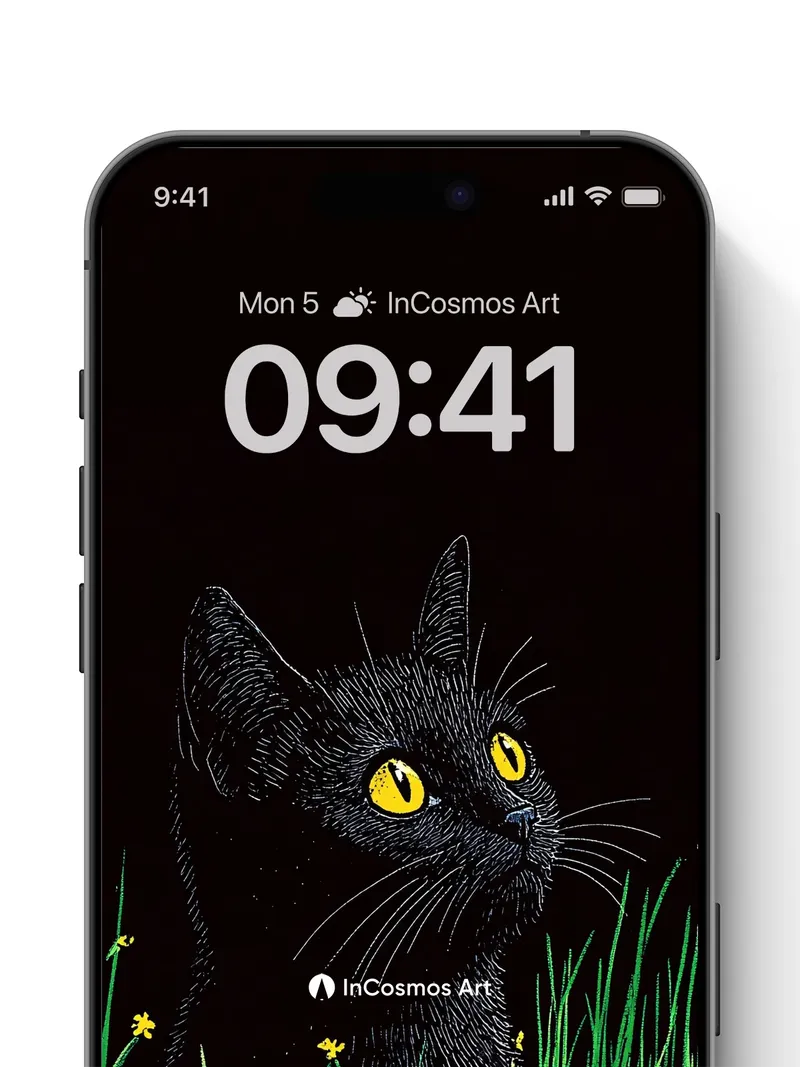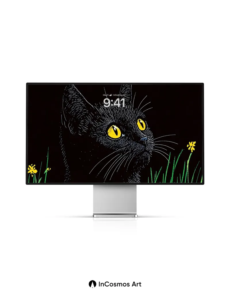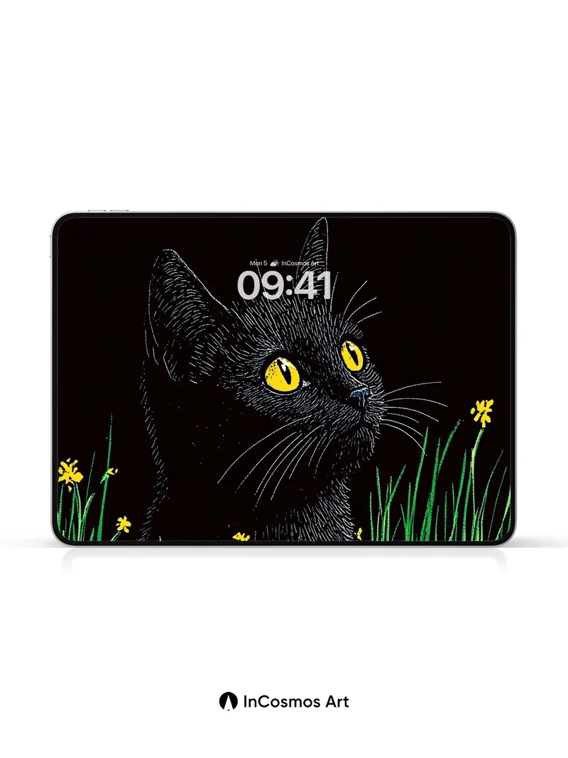 Debug product.metafields.custom.desc: Did you know black cats were once believed to be guardians of the night, their eyes reflecting moonlight like tiny suns? This illustration captures that ancient mystique—its fur a velvet void, each whisker etched in fine silver thread, while dandelion-yellow blooms pierce the dark like scattered stars. You’ll feel the cool grass beneath your fingertips and hear the silence between breaths.