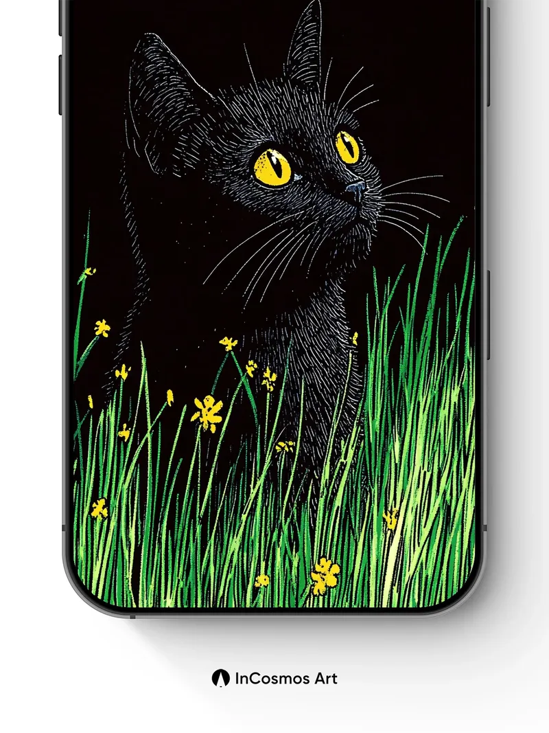 Did you know black cats were once believed to be guardians of the night, their eyes reflecting moonlight like tiny suns? This illustration captures that ancient mystique—its fur a velvet void, each whisker etched in fine silver thread, while dandelion-yellow blooms pierce the dark like scattered stars. You’ll feel the cool grass beneath your fingertips and hear the silence between breaths.