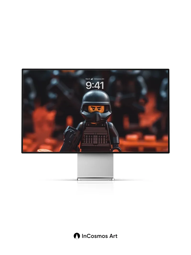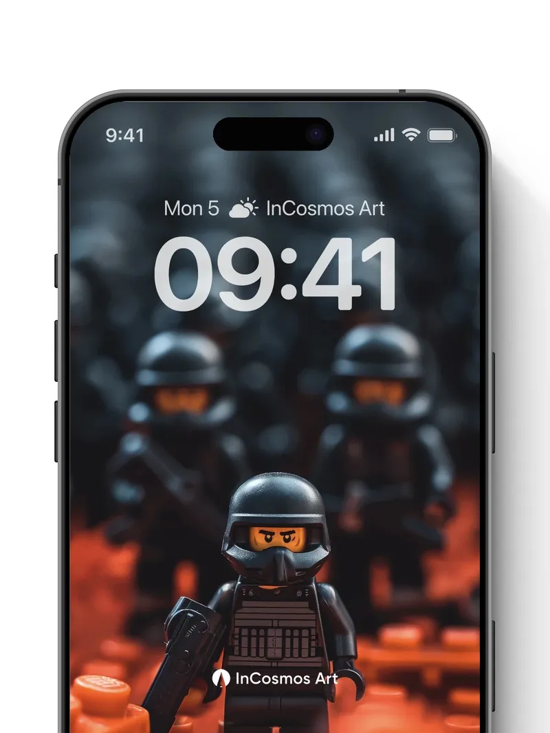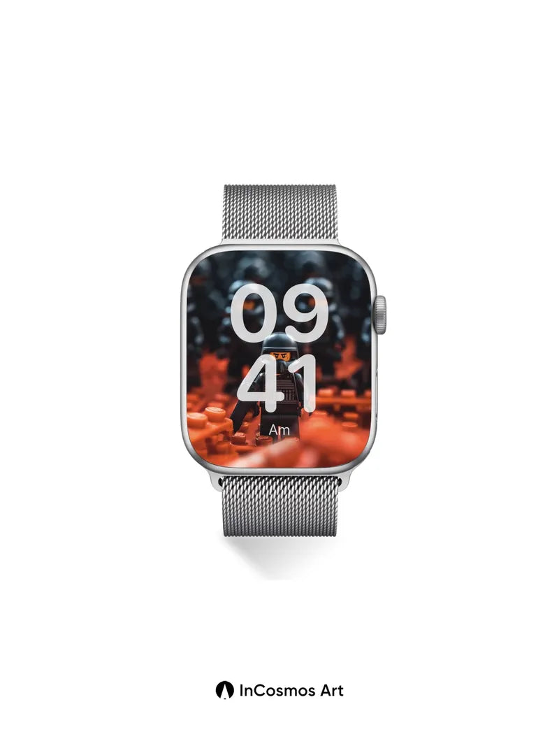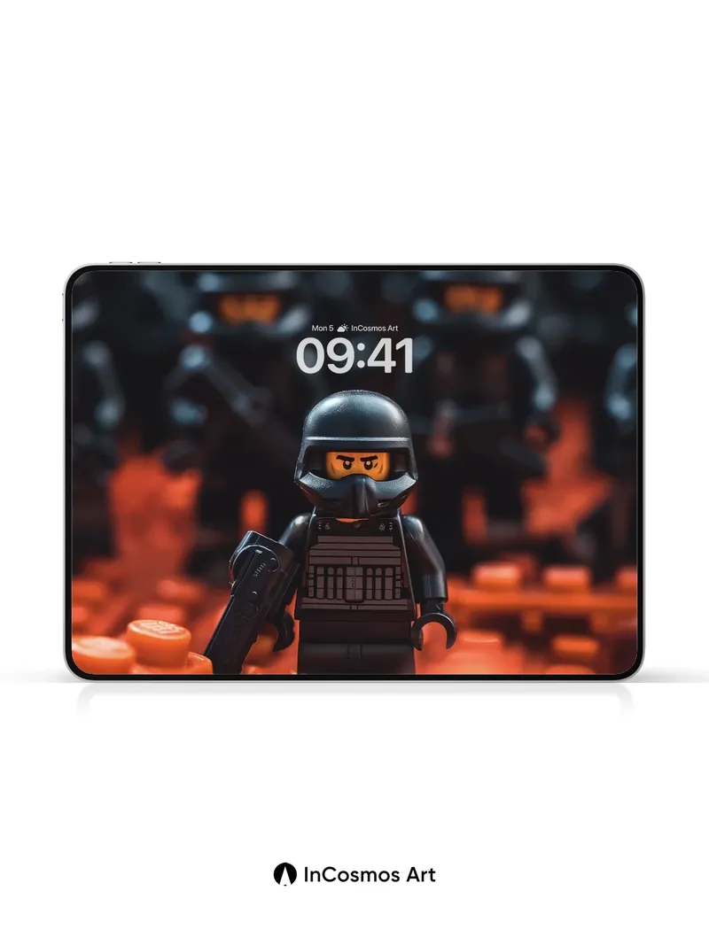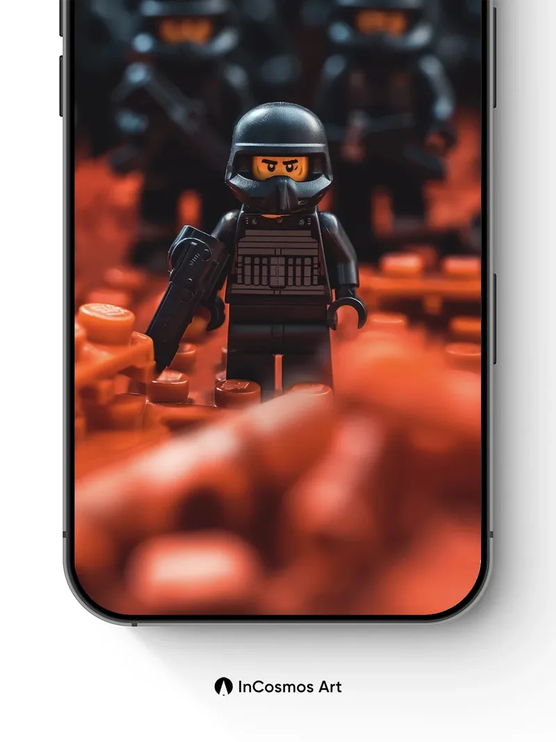 Debug product.metafields.custom.desc: Did you know LEGO minifigures were originally designed to be interchangeable with other toy systems? Here, a lone soldier stands sharp in matte black armor, light crawling over textured plates like oil on steel, while a sea of blurred comrades fades into the haze behind. The red-orange ground pulses beneath them, as if heated by unseen flames—each stud a heartbeat in a silent march toward destiny.