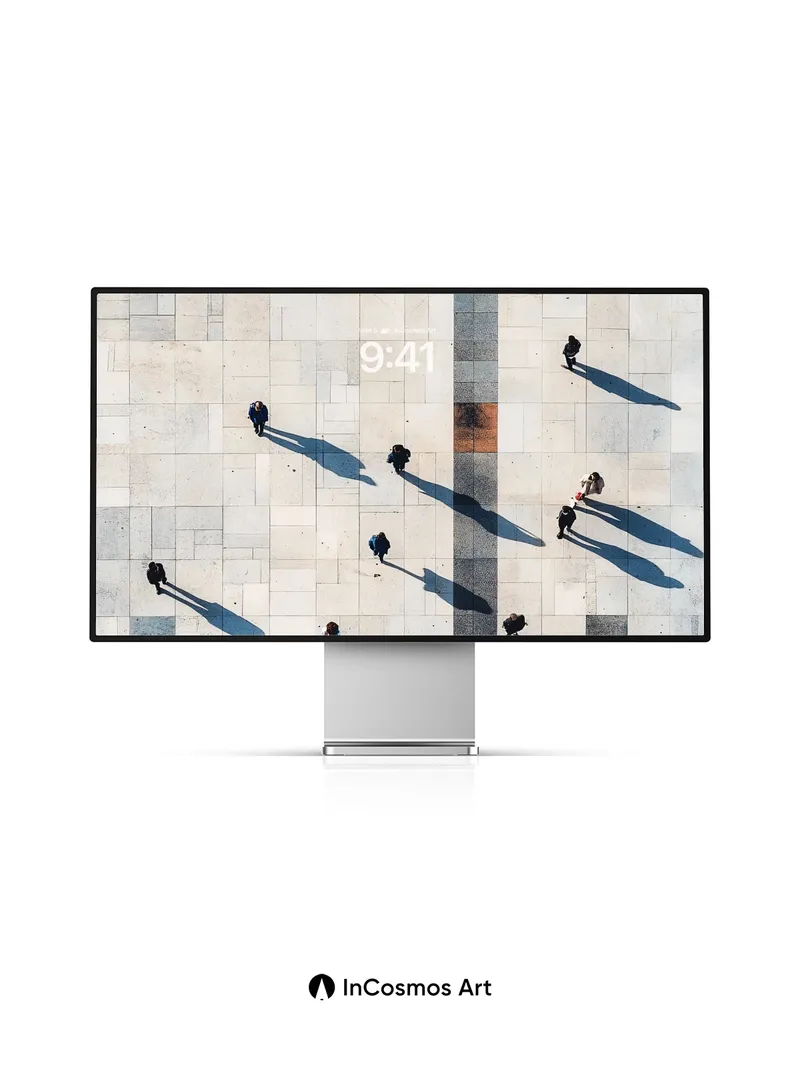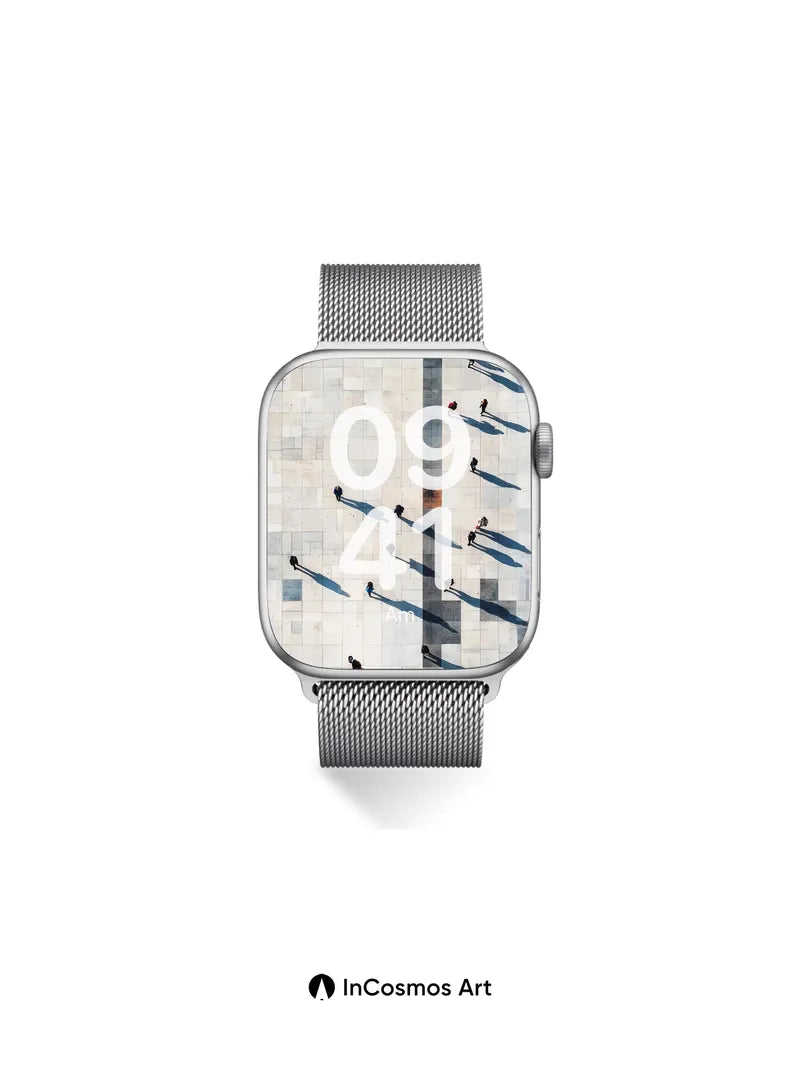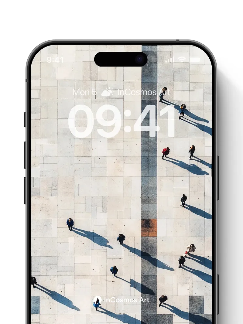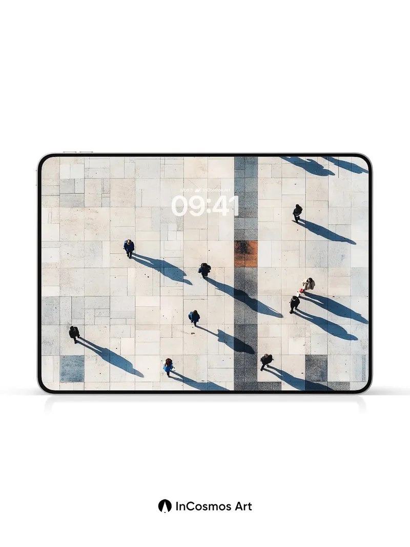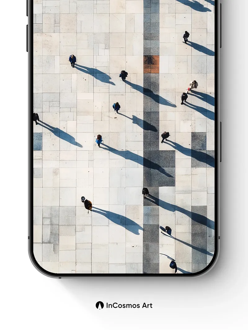Debug product.metafields.custom.desc: Did you know sunlight casts shadows longer than the people who walk beneath it? On this vast stone plaza, each figure leaves a trail of dark ink across the pale tiles, as if time itself were writing stories in silence. The central stripe—dark, precise, like a spine—divides the world into two realms: one where light breathes gently over marble, and another where movement becomes poetry.
