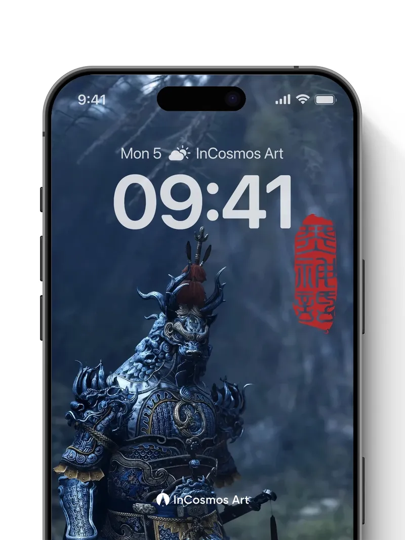 Debug page_description: Did you know ancient Chinese armor was sometimes inlaid with silver to reflect moonlight during night battles? This warrior stands motionless, his steel-plated form etched with dragon motifs that seem to breathe under the dim forest glow, while a crimson seal floats like a memory above him—its ink still wet in the mist. The air hums with silence, and every scale of his armor holds a story written in frost and fire. Share this with your best friend. Send this to your love and swap a matching set. What if the seal could speak?