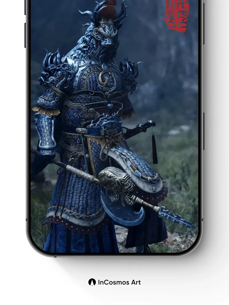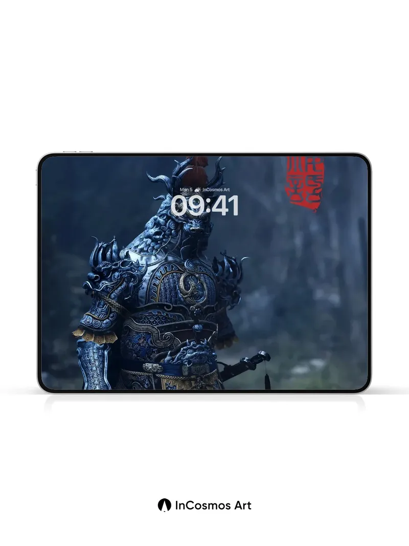 Debug product.metafields.custom.desc: Did you know ancient Chinese armor was sometimes inlaid with silver to reflect moonlight during night battles? This warrior stands motionless, his steel-plated form etched with dragon motifs that seem to breathe under the dim forest glow, while a crimson seal floats like a memory above him—its ink still wet in the mist. The air hums with silence, and every scale of his armor holds a story written in frost and fire.
