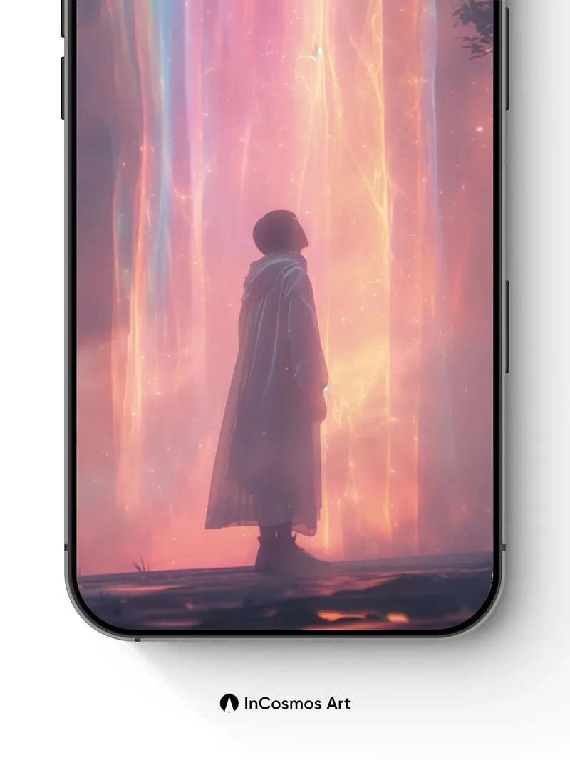 Debug page_description: Did you know the Northern Lights can be seen from space as shimmering ribbons of charged particles dancing through Earth’s magnetic field? Here, they pulse like living silk, woven into a vertical tapestry of molten light that breathes warmth into the night. A lone figure stands in quiet reverence, their cloak caught in a whisper of wind, as if time itself has paused to witness this celestial communion. Share this with your best friend. Send this to your love and swap a matching set. What would you say if the sky began to speak?