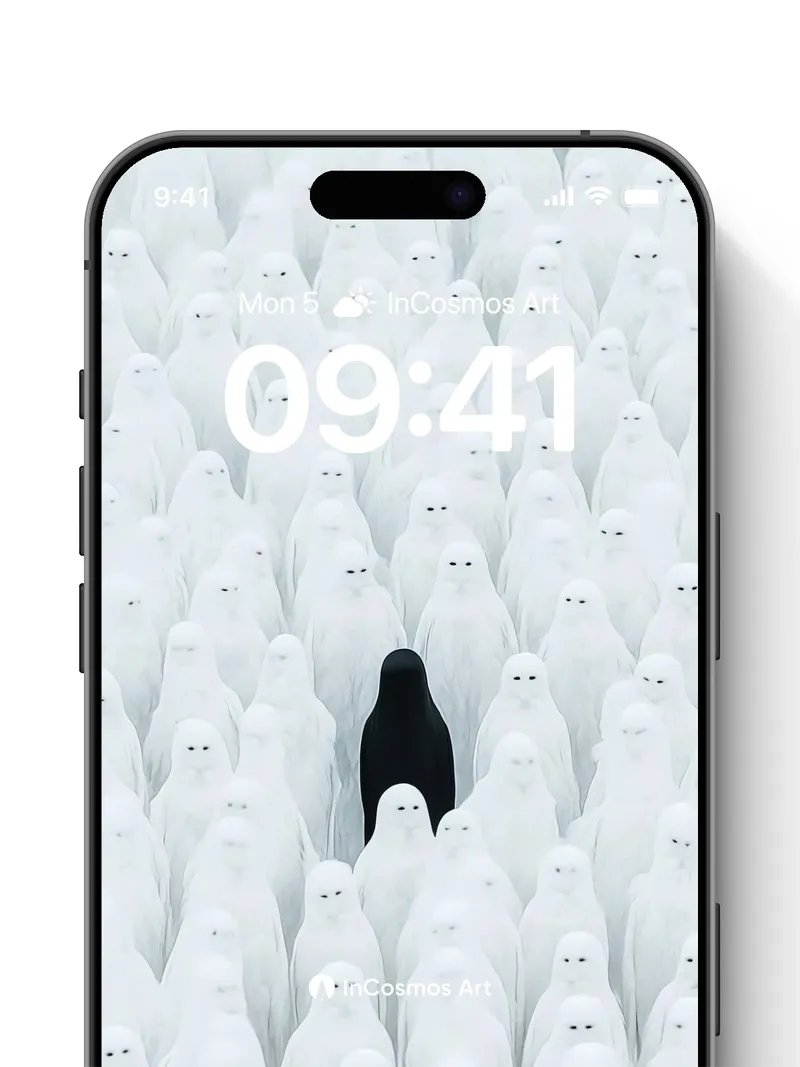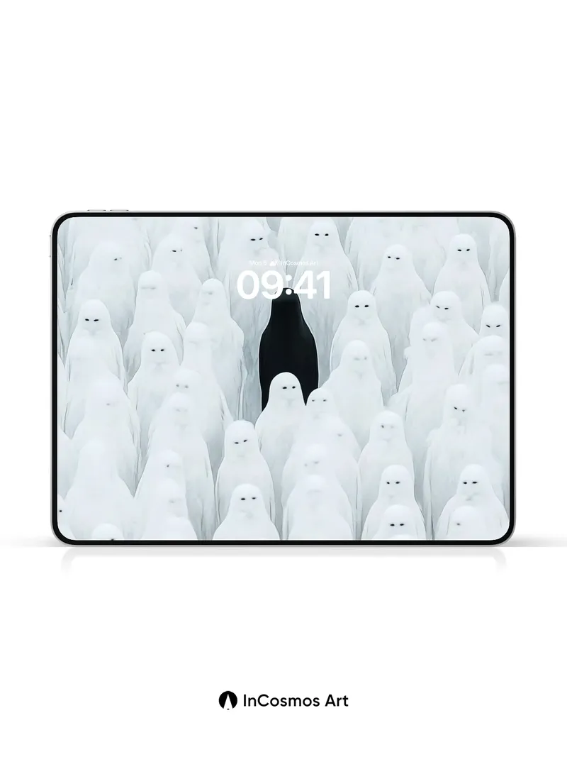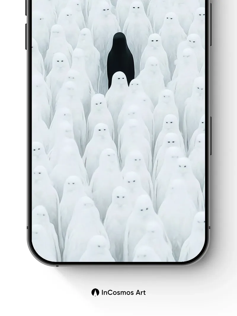 Debug product.metafields.custom.desc: Did you know that in ancient Japanese folklore, a single black bird among white ones was believed to carry the soul of a lost wanderer? Here, light breathes over endless ghostly forms, their blank eyes fixed forward like frozen thoughts, while one dark figure stands alone—silent, unyielding, and profoundly human. The contrast hums with quiet rebellion, a whisper against uniformity.