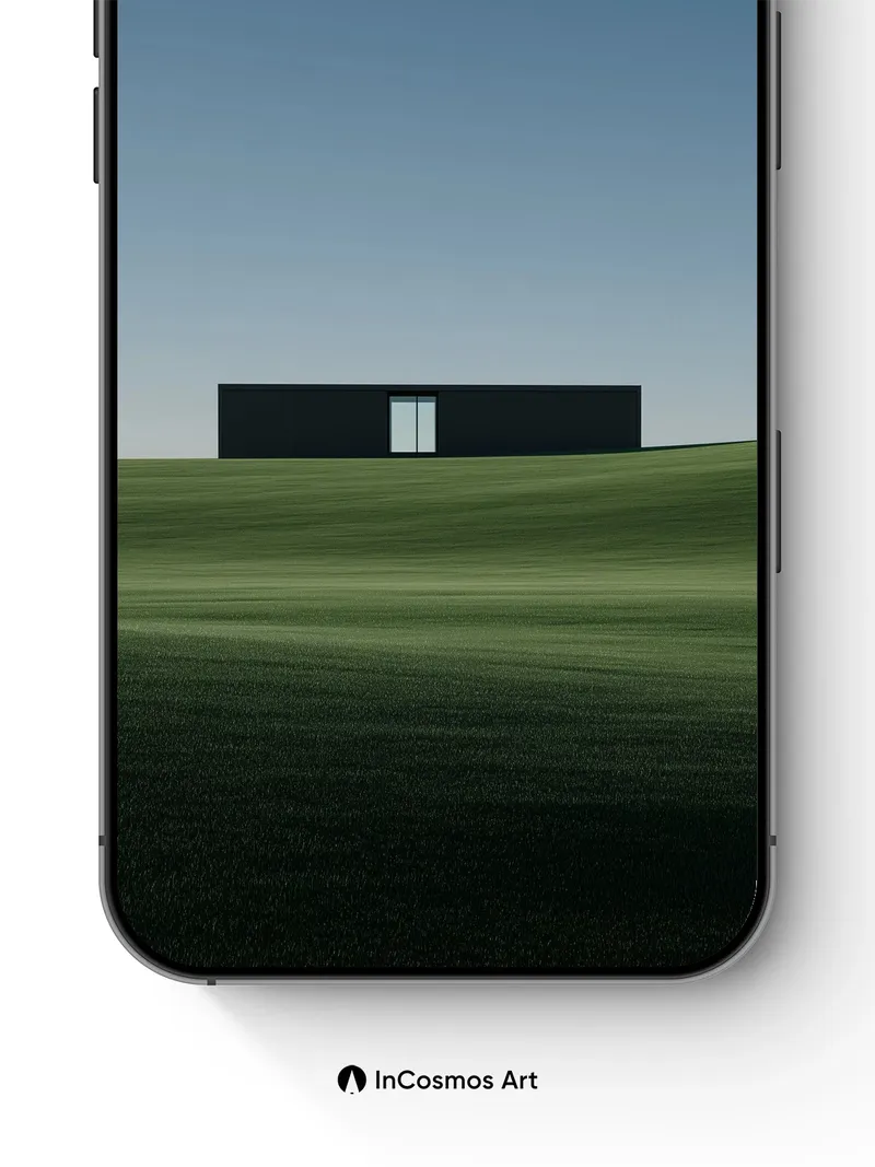 Did you know the longest straight line on Earth is visible only from space? Here, a monolithic black form floats above an endless green field, its single glass portal reflecting the sky like a mirror of stillness. The grass breathes in soft waves beneath a gradient sky that deepens into twilight, while light crawls across the structure’s surface like time itself slowing down.