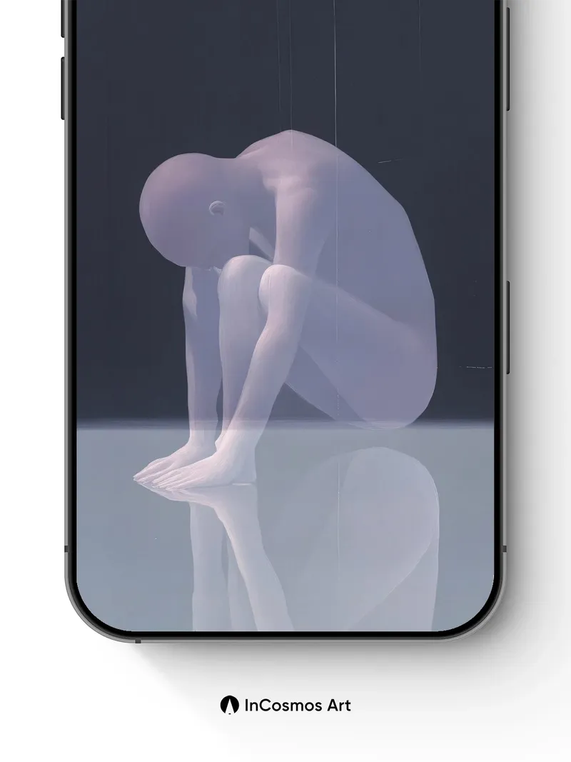 Debug page_description: Did you know light can bend through translucent forms like a whisper across still water? This figure, rendered in soft lavender mist, bows into itself as if listening to the echo of its own breath—its silhouette mirrored perfectly on a glass floor that swallows depth and returns only silence. The darkness above hums with absence, while the glow beneath suggests something buried just beneath the surface. Share this with your best friend. Send this to your love and swap a matching set. What if quietness had a shape?