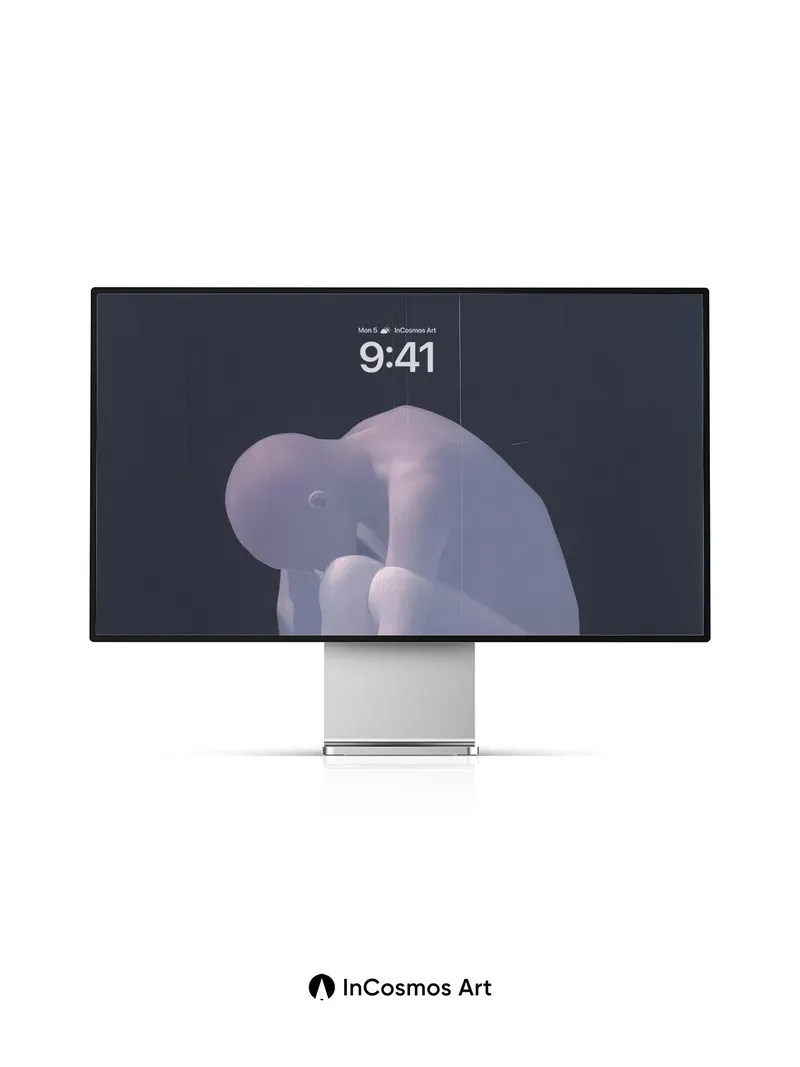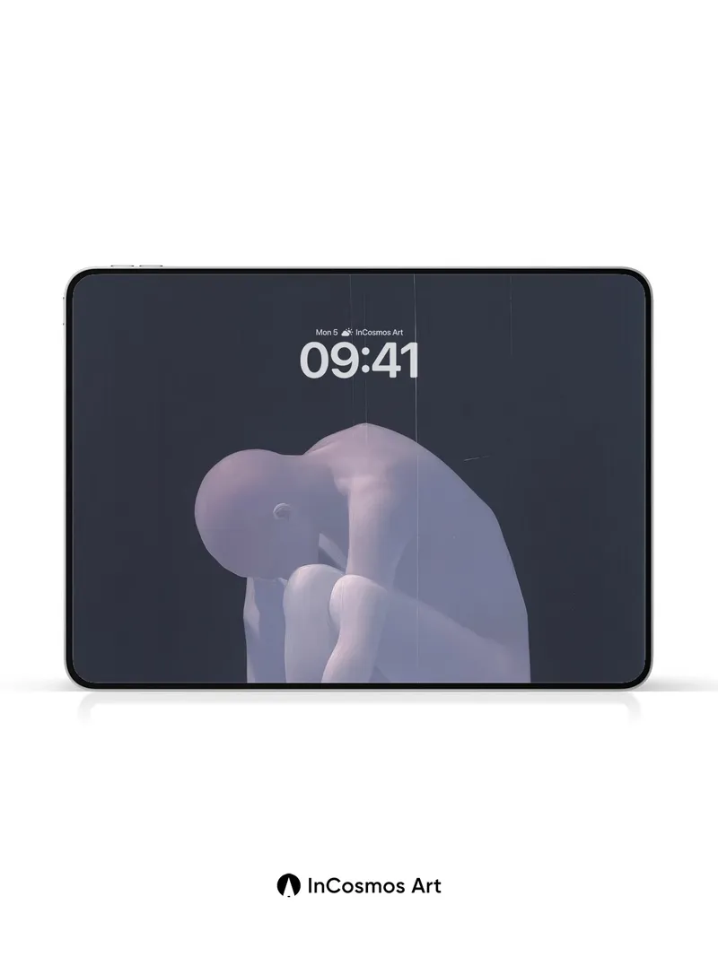 Debug product.metafields.custom.desc: Did you know light can bend through translucent forms like a whisper across still water? This figure, rendered in soft lavender mist, bows into itself as if listening to the echo of its own breath—its silhouette mirrored perfectly on a glass floor that swallows depth and returns only silence. The darkness above hums with absence, while the glow beneath suggests something buried just beneath the surface.