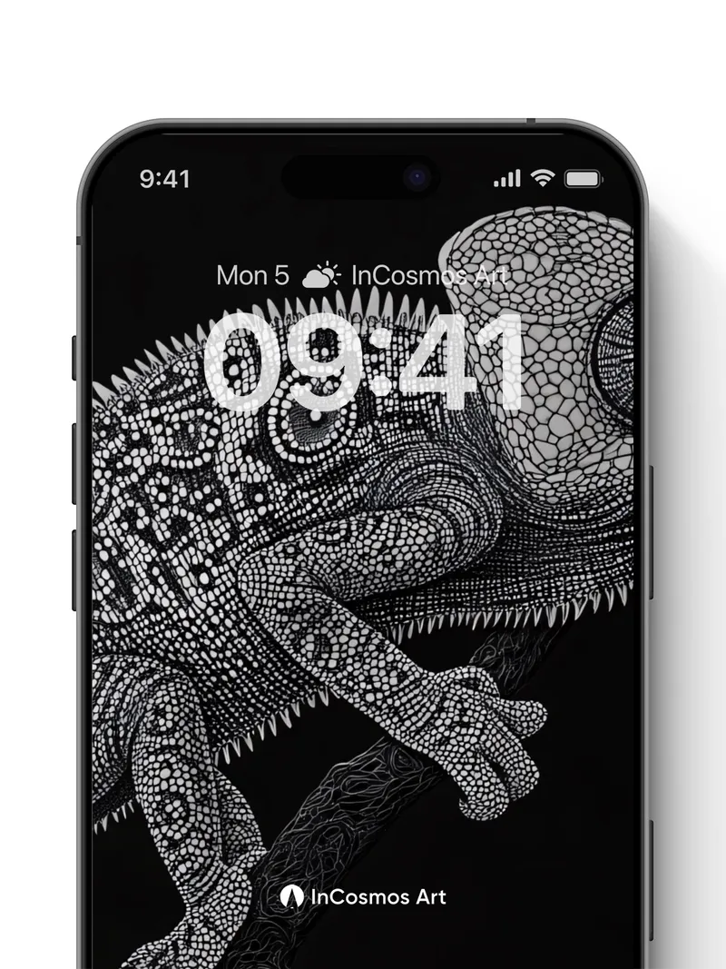 Debug page_description: Did you know chameleons can rotate their eyes independently, scanning the world in two directions at once? This intricate monochrome design transforms the reptile’s skin into a living mosaic of dots and spirals, where every scale hums with hidden rhythm. The dark void around it breathes like night itself, framing the creature not as prey or predator, but as an ancient glyph carved from shadow and precision. Share this with your best friend. Send this to your love and swap a matching set. What if your walls could whisper secrets in patterns only you understand?