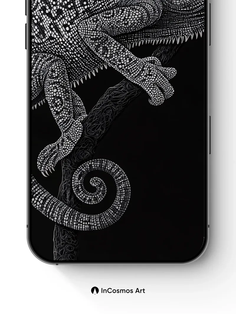 Did you know chameleons can rotate their eyes independently, scanning the world in two directions at once? This intricate monochrome design transforms the reptile’s skin into a living mosaic of dots and spirals, where every scale hums with hidden rhythm. The dark void around it breathes like night itself, framing the creature not as prey or predator, but as an ancient glyph carved from shadow and precision.