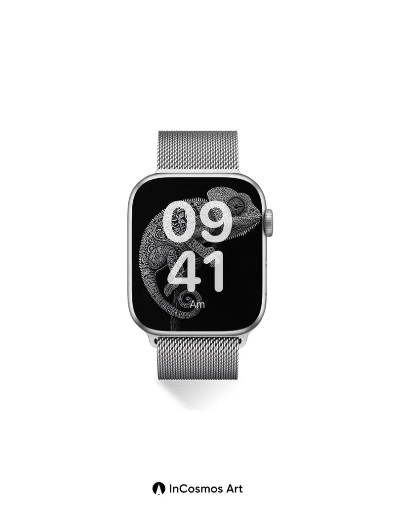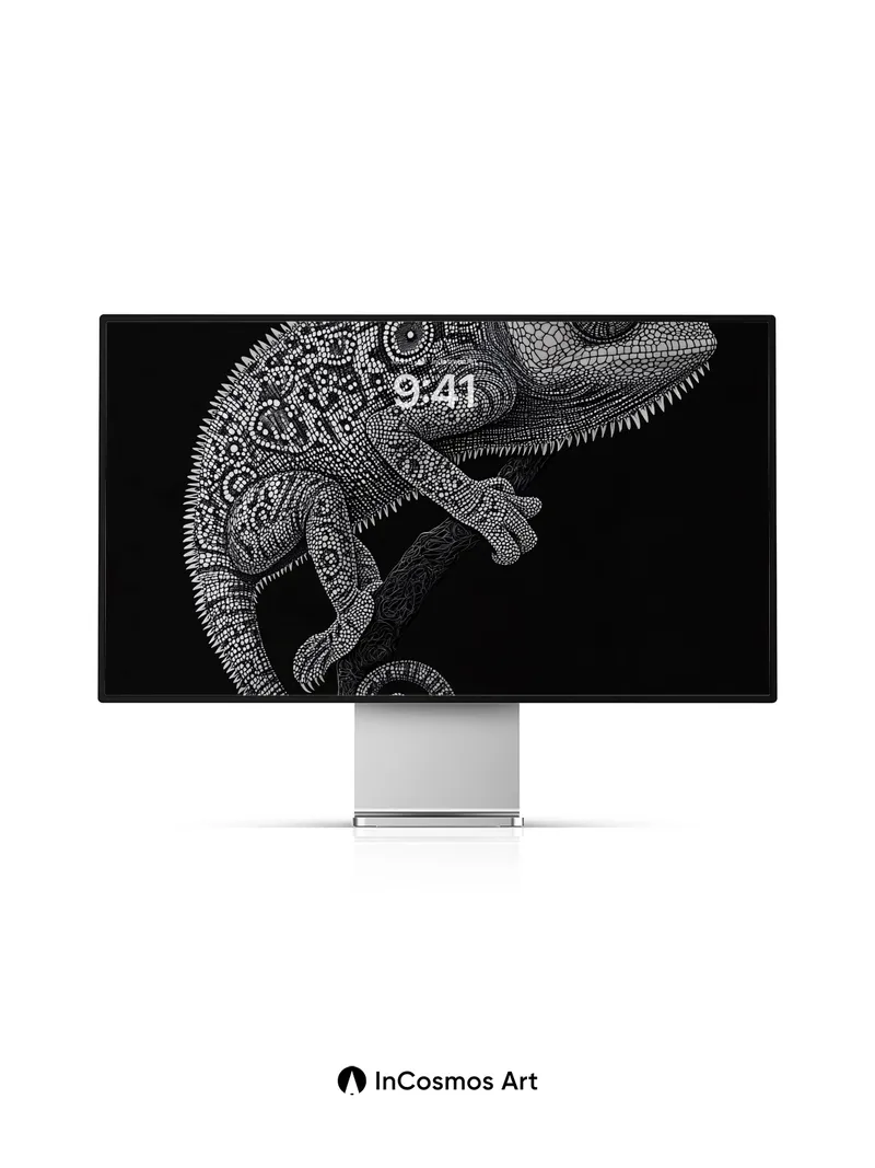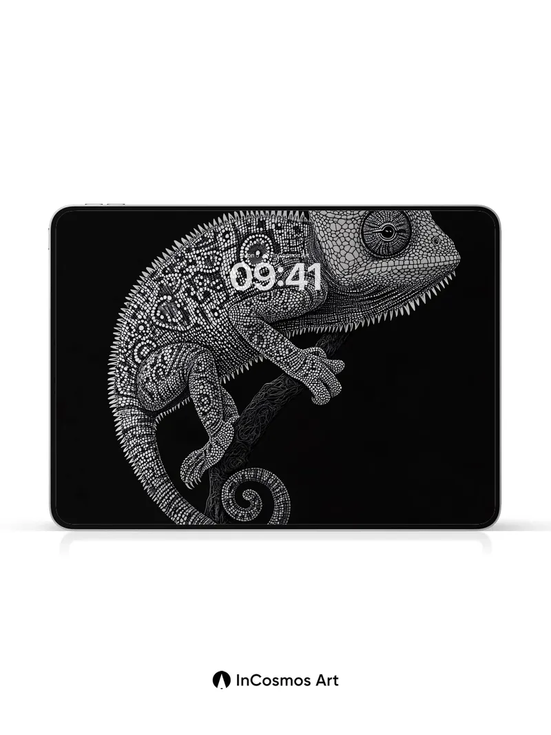 Debug product.metafields.custom.desc: Did you know chameleons can rotate their eyes independently, scanning the world in two directions at once? This intricate monochrome design transforms the reptile’s skin into a living mosaic of dots and spirals, where every scale hums with hidden rhythm. The dark void around it breathes like night itself, framing the creature not as prey or predator, but as an ancient glyph carved from shadow and precision.