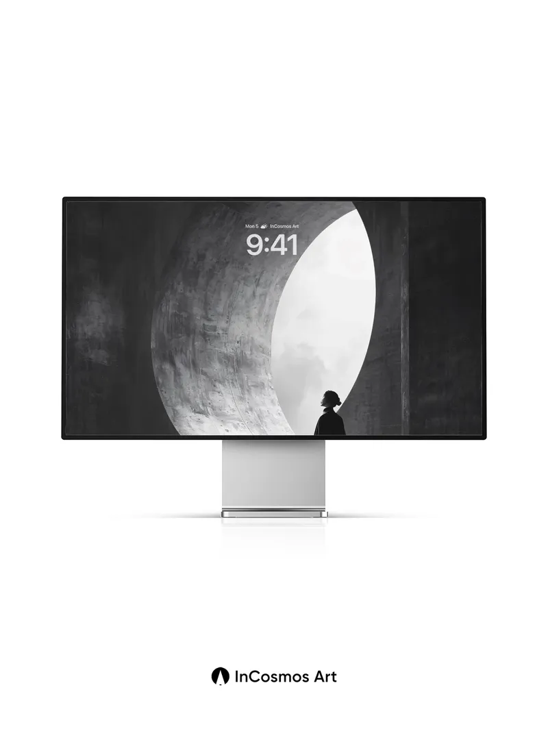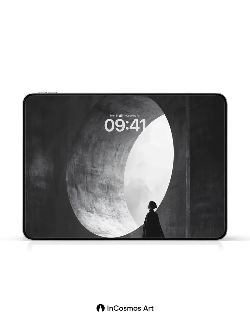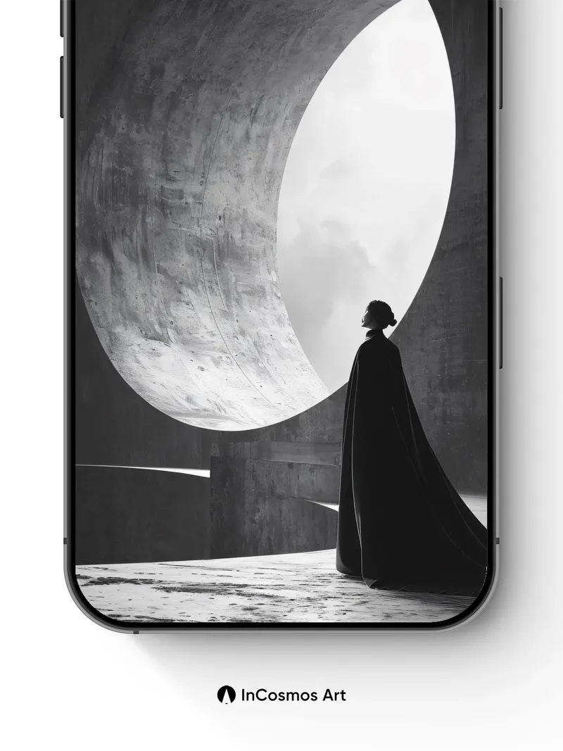 Debug product.metafields.custom.desc: Did you know the moon’s surface is covered in ancient volcanic glass? Here, it glows like a living mirror through colossal concrete arches, where light crawls over rough textures and shadows breathe in stillness. A solitary figure in a flowing cloak stands at the threshold, not between worlds but within one — where architecture dreams of the cosmos and silence sings louder than sound.