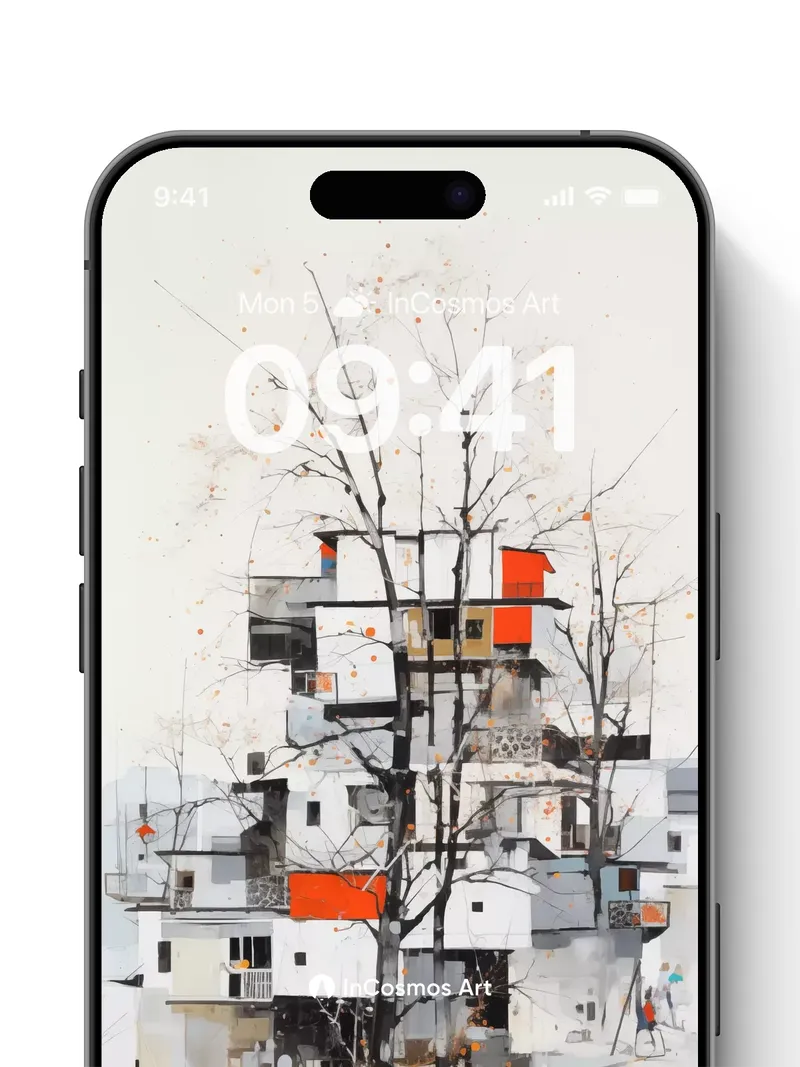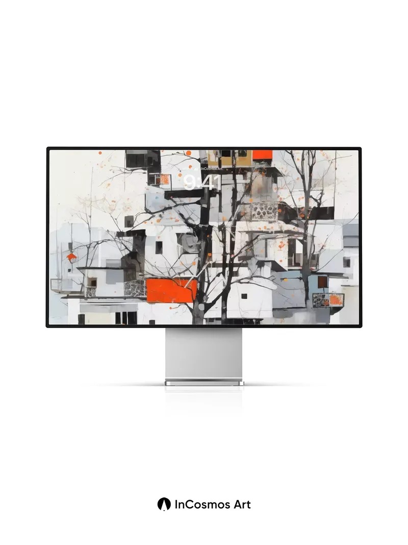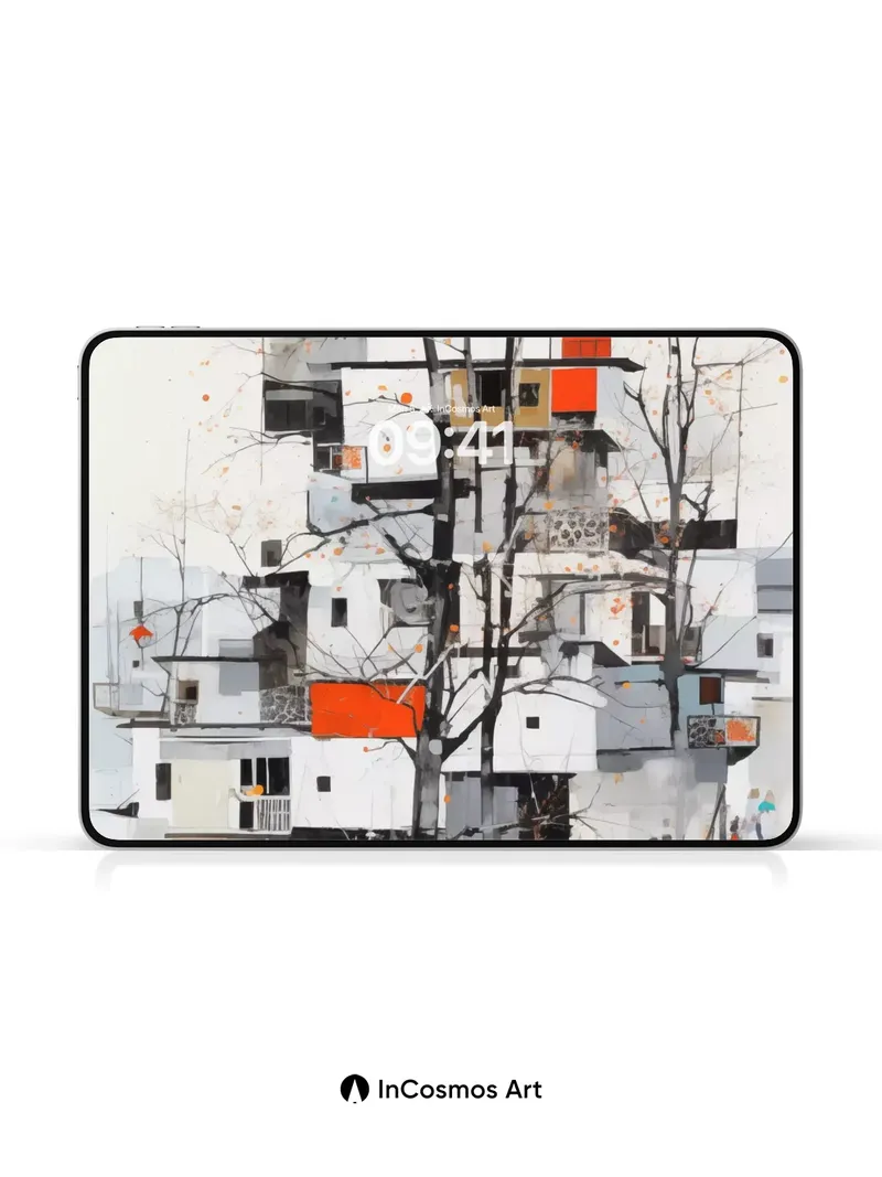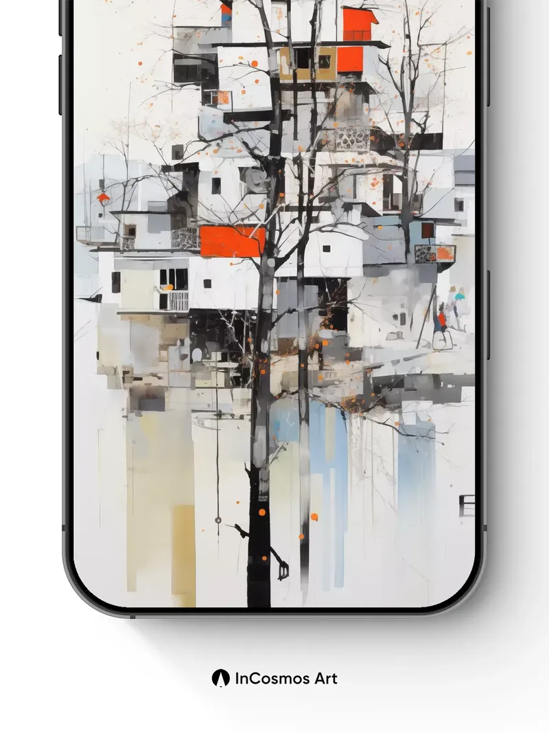 Debug product.metafields.custom.desc: Did you know that the reflection of a city in still water can mirror time itself? Here, bare branches stretch like fingers across a fractured skyline, their shadows bleeding into mirrored pools where light hesitates. The buildings rise in fragmented geometry, painted in stark whites and bold orange accents, as if architecture were an unfinished poem written in ink and silence.