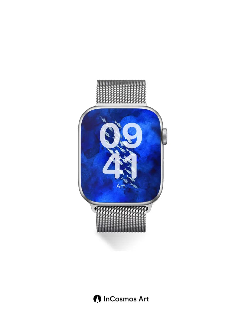 Debug product.metafields.custom.desc: Did you know that fish in a school swim in unison using a sensory system called the lateral line, detecting vibrations in water like an invisible net? Here, silver silhouettes glide through a swirling abyss of indigo and sapphire, their forms etched against a living canvas of ink-washed depth. The ocean breathes beneath them—each stroke of pigment a slow exhale from the deep.