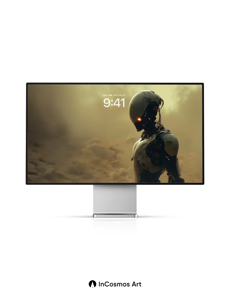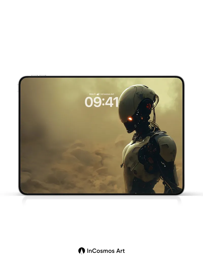 Debug product.metafields.custom.desc: Did you know that the first artificial intelligence was designed to mimic human thought patterns in the 1950s? Here, a lone android stands amidst swirling dust, its chrome spine catching the last light of a dying sun. Its red optical sensor pulses like a heartbeat beneath a cracked visor, while sand crawls over cold joints as if time itself is eroding metal. You feel the weight of solitude not in silence, but in the way shadows cling to its frame—like memories refusing to fade.
