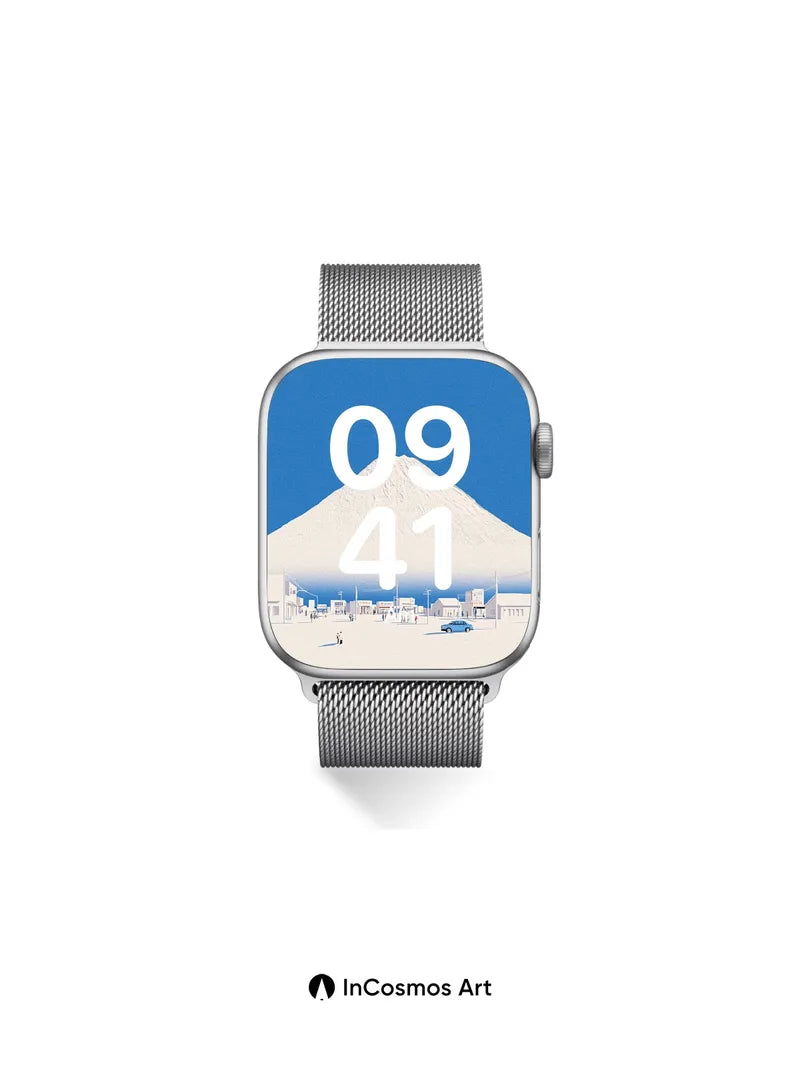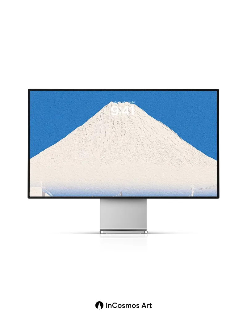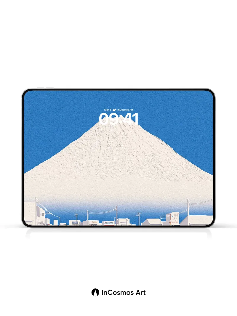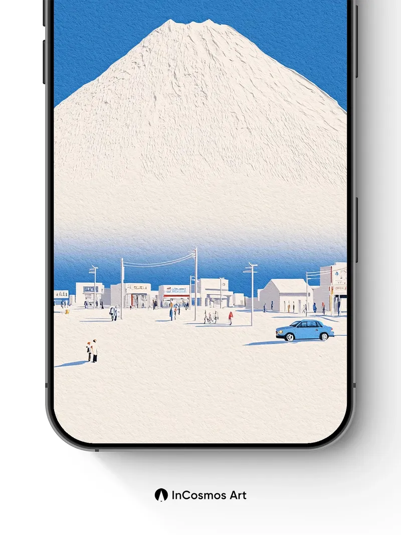 Debug product.metafields.custom.desc: Did you know that Mount Fuji's snow cap reflects nearly 90% of sunlight, making it one of the most luminous natural surfaces on Earth? Here, the mountain stands like a frozen breath under an infinite blue sky, its slopes glowing with a soft, almost ethereal radiance. Below, a quiet village rests in stillness—buildings sharp and clean, shadows crisp as if drawn by hand, and a lone blue car parked like a tiny artifact in time.