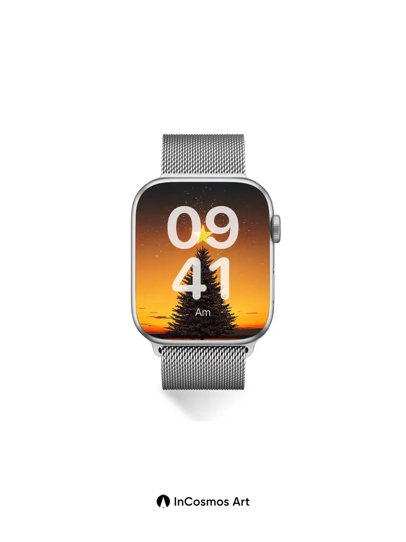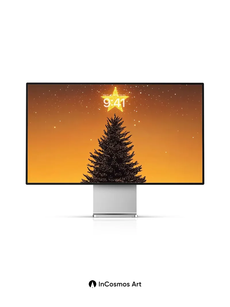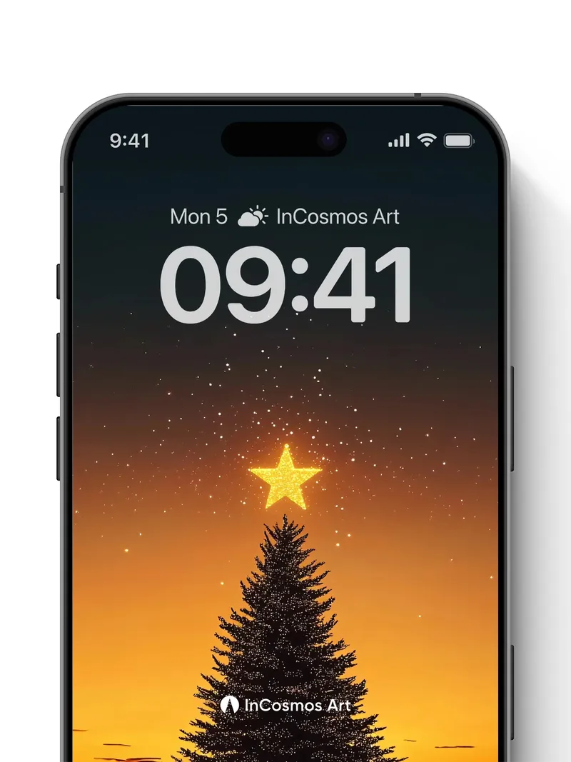 Debug product.metafields.custom.desc: Did you know the first Christmas tree in America was lit by candles in 1747? This solitary pine stands like a dark silhouette against a sky where fire meets night, its branches dusted with tiny stars that seem to breathe in rhythm with the horizon’s pulse. Above it, a radiant golden star floats—its light not just shining but whispering secrets of distant galaxies and quiet hope.