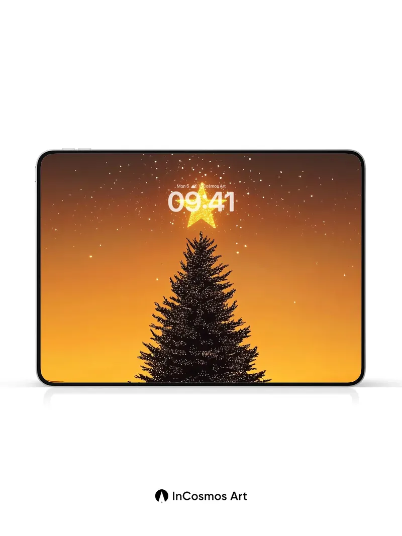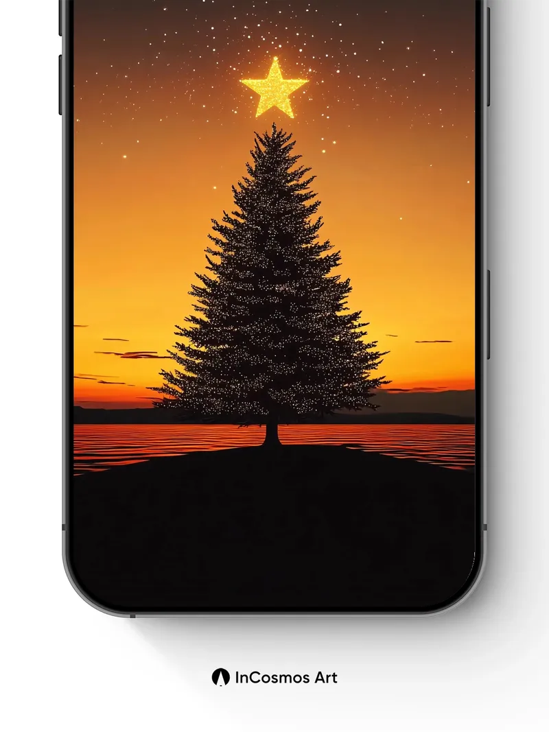 Did you know the first Christmas tree in America was lit by candles in 1747? This solitary pine stands like a dark silhouette against a sky where fire meets night, its branches dusted with tiny stars that seem to breathe in rhythm with the horizon’s pulse. Above it, a radiant golden star floats—its light not just shining but whispering secrets of distant galaxies and quiet hope.