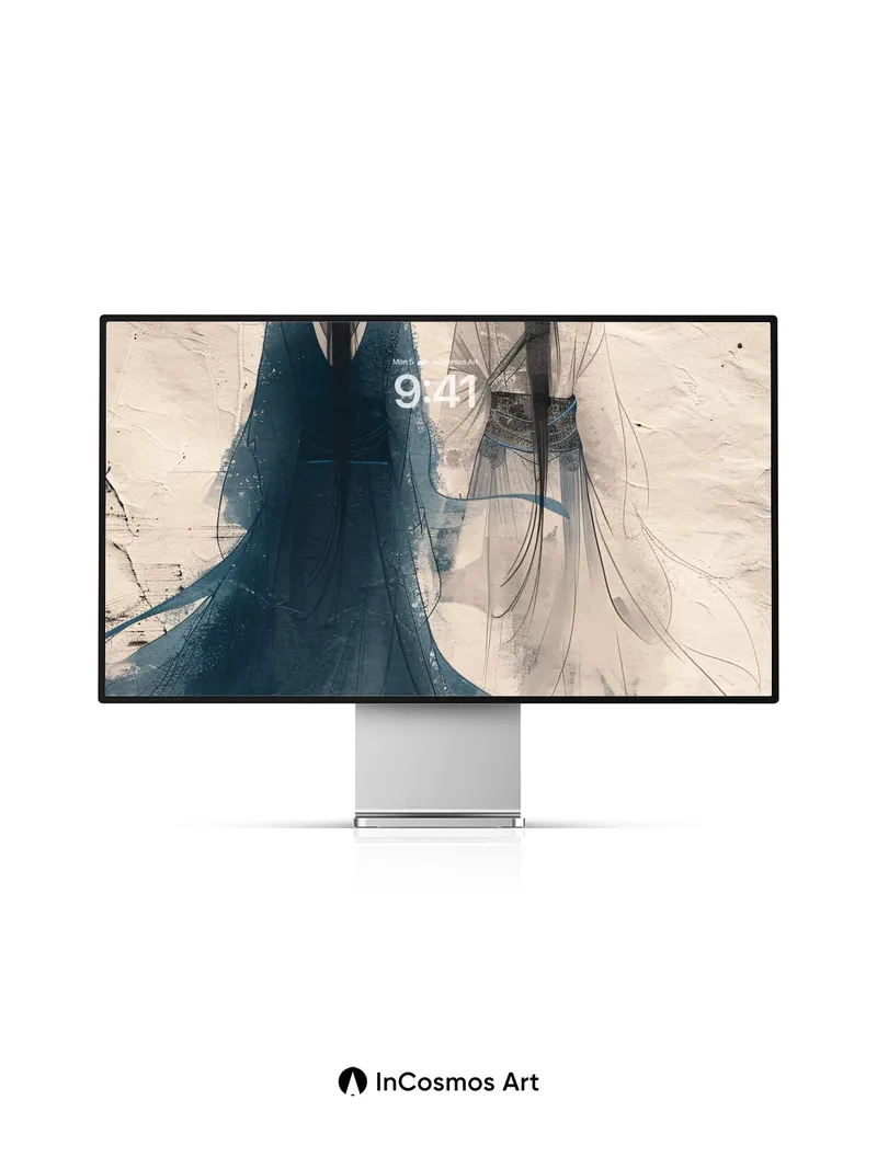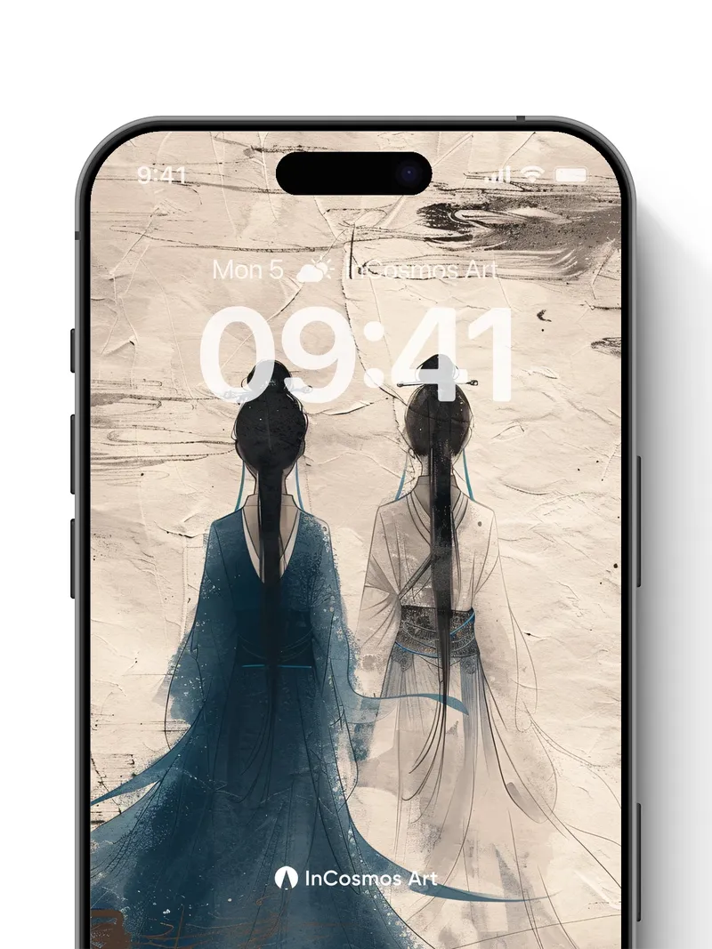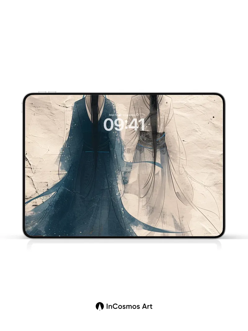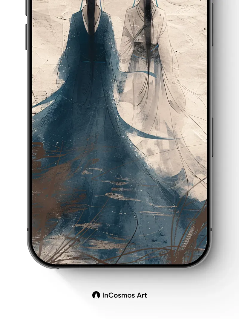 Debug page_description: Did you know ancient Chinese ink paintings were made with soot and animal glue, creating depths that seem to breathe? Two figures in flowing robes walk away from the viewer, their silhouettes etched in midnight blue and misty white against a parchment-like ground, where watercolor stains bleed like memories into the earth. The wind carries whispers through reeds at the edge of a still lake, as if time itself has paused to watch them vanish. Share this with your best friend. Send this to your love and swap a matching set. What if silence had a color?