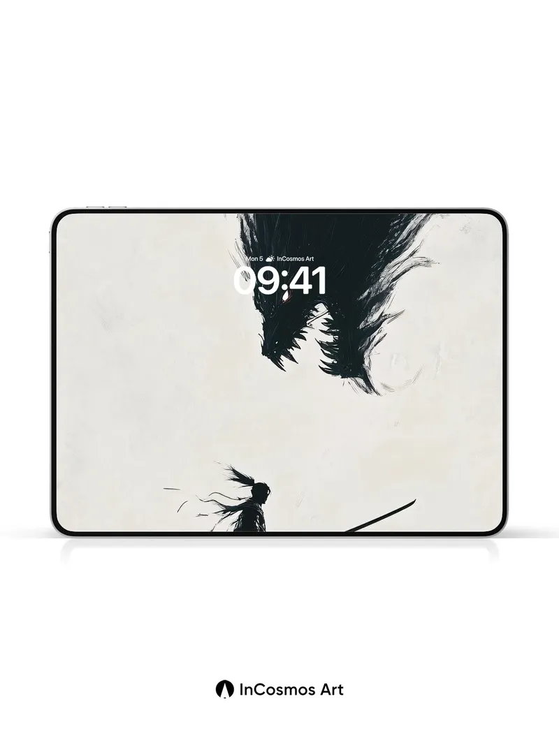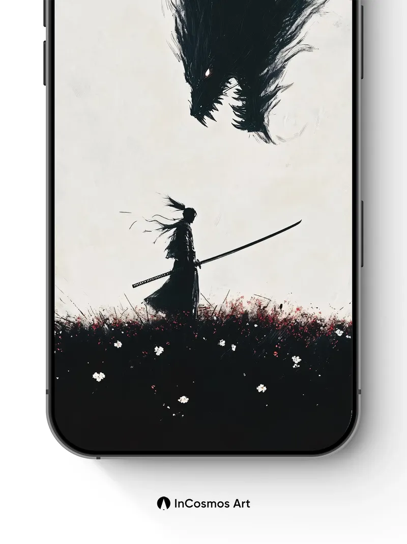Debug product.metafields.custom.desc: Did you know that traditional Japanese sumi-e paintings use only black ink to convey entire worlds? Here, a lone samurai stands beneath a monstrous dragon rendered in bold, flowing brushstrokes—its form both shadow and storm. The ground blooms with scattered cherry blossoms, their delicate petals catching the last light before night falls. You feel the weight of the sword in your hand, the breath of the beast above, and the quiet courage of one who faces the unknown.